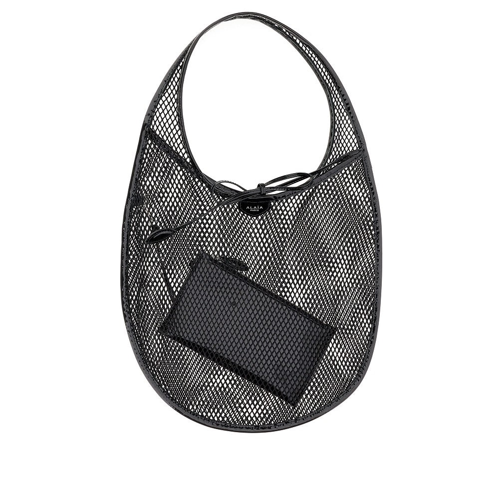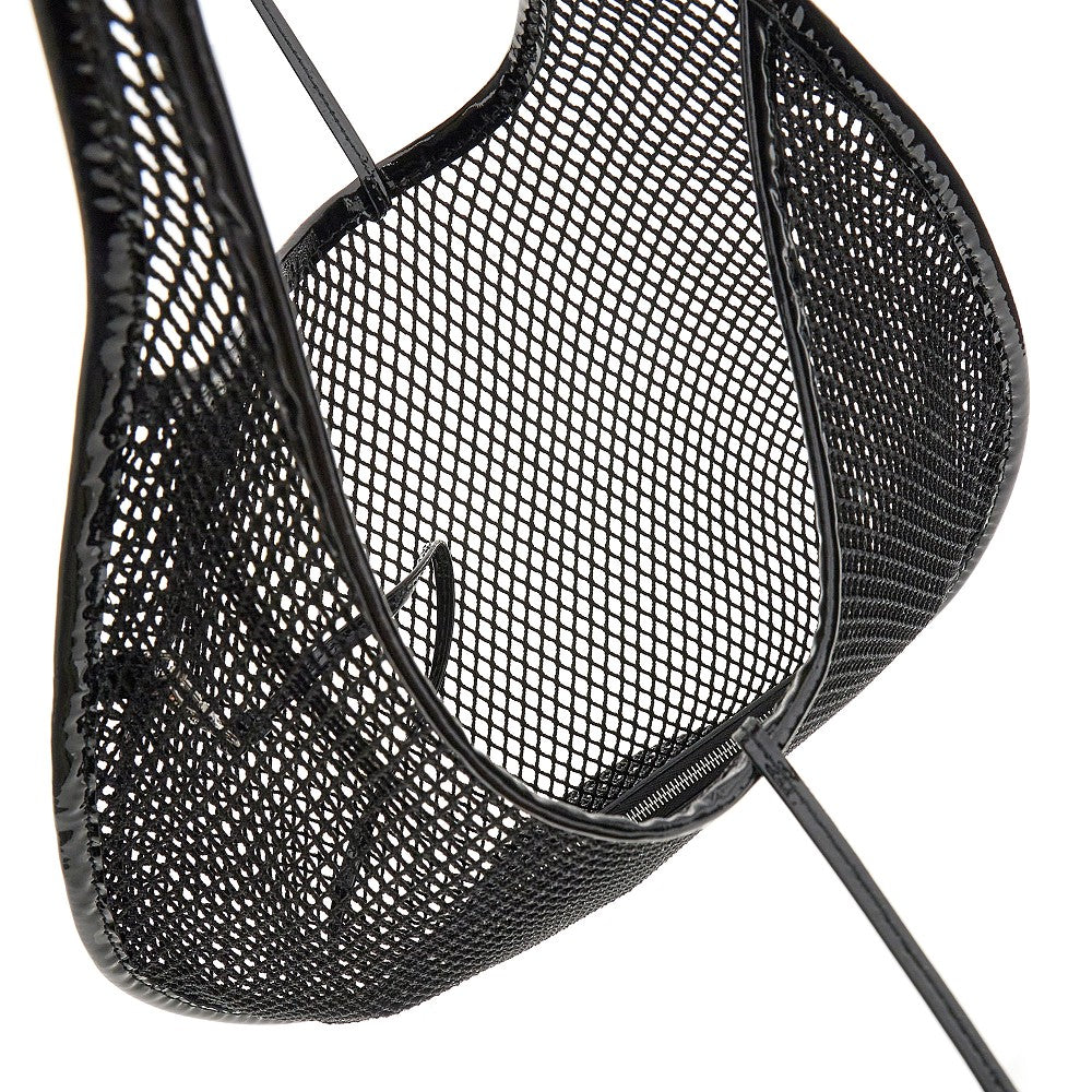 Medium One Piece shoulder bag made from net technical fabric with patent leather details. Front tab with silver-tone logo print. Self-tie stripes closure. Unlined interior equipped with a detachable patent leather pouch with zip closure and front debossed logo.