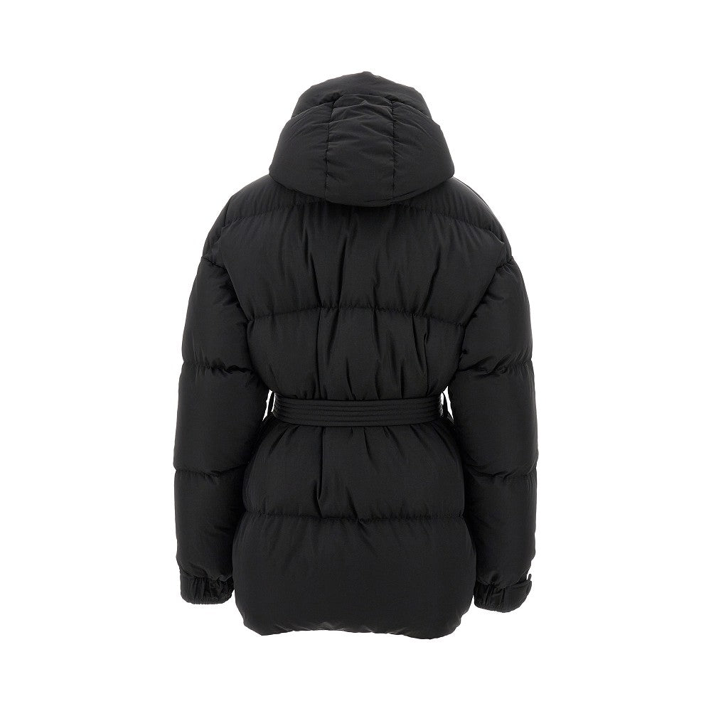 Short down jacket made from soft nylon with goose down padding, featuring slouchy and voluminous silhouette inspired by the Michlin Man with matching belt on the waist. Two-way zip closure and flap with press-studs. Patch pockets. Hood. Adjustable and elasticated cuffs.