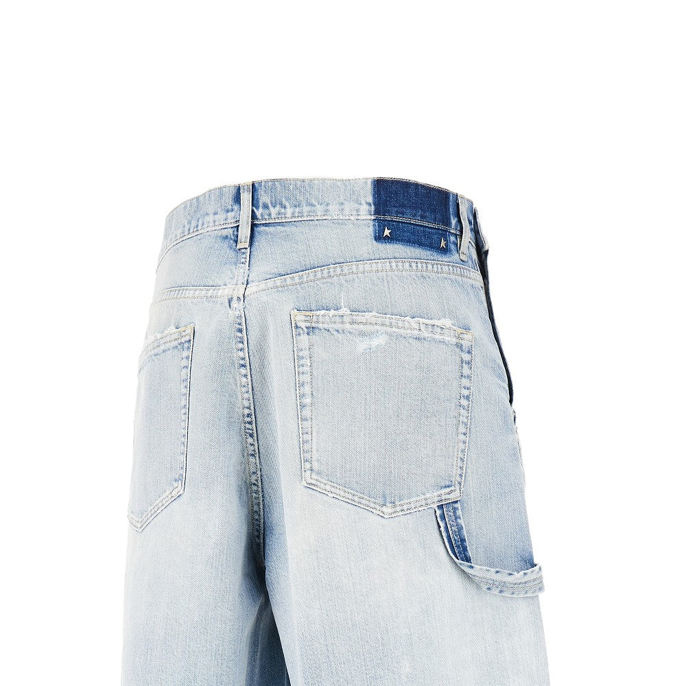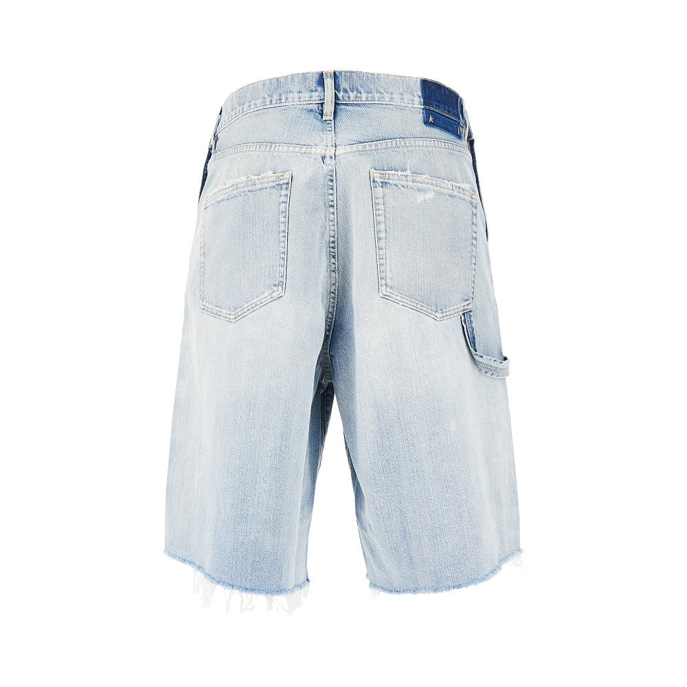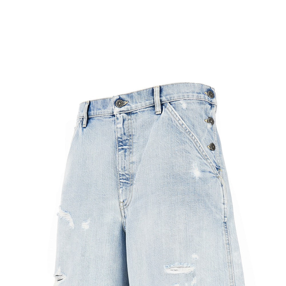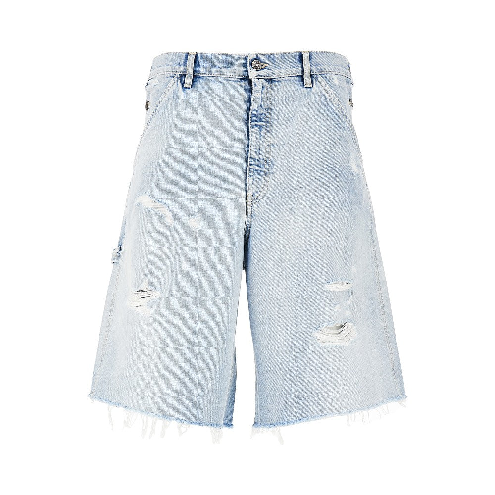 Shorts made from light wash cotton denim with distressed effect and frayed edges, featuring branded buttoning on the sides. Belt loops, zip fly and button closure. Side slanted pockets and rear patch ones. Relaxed fit. Star studs at waist back.