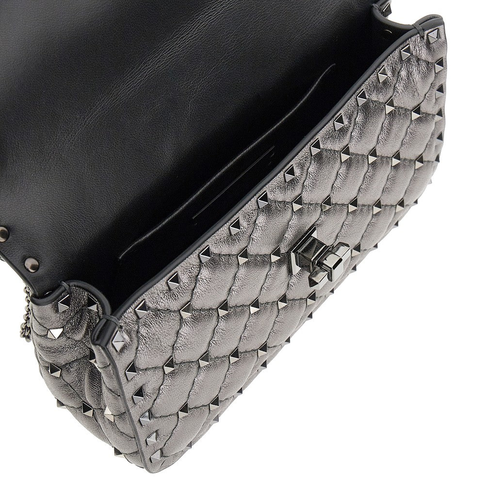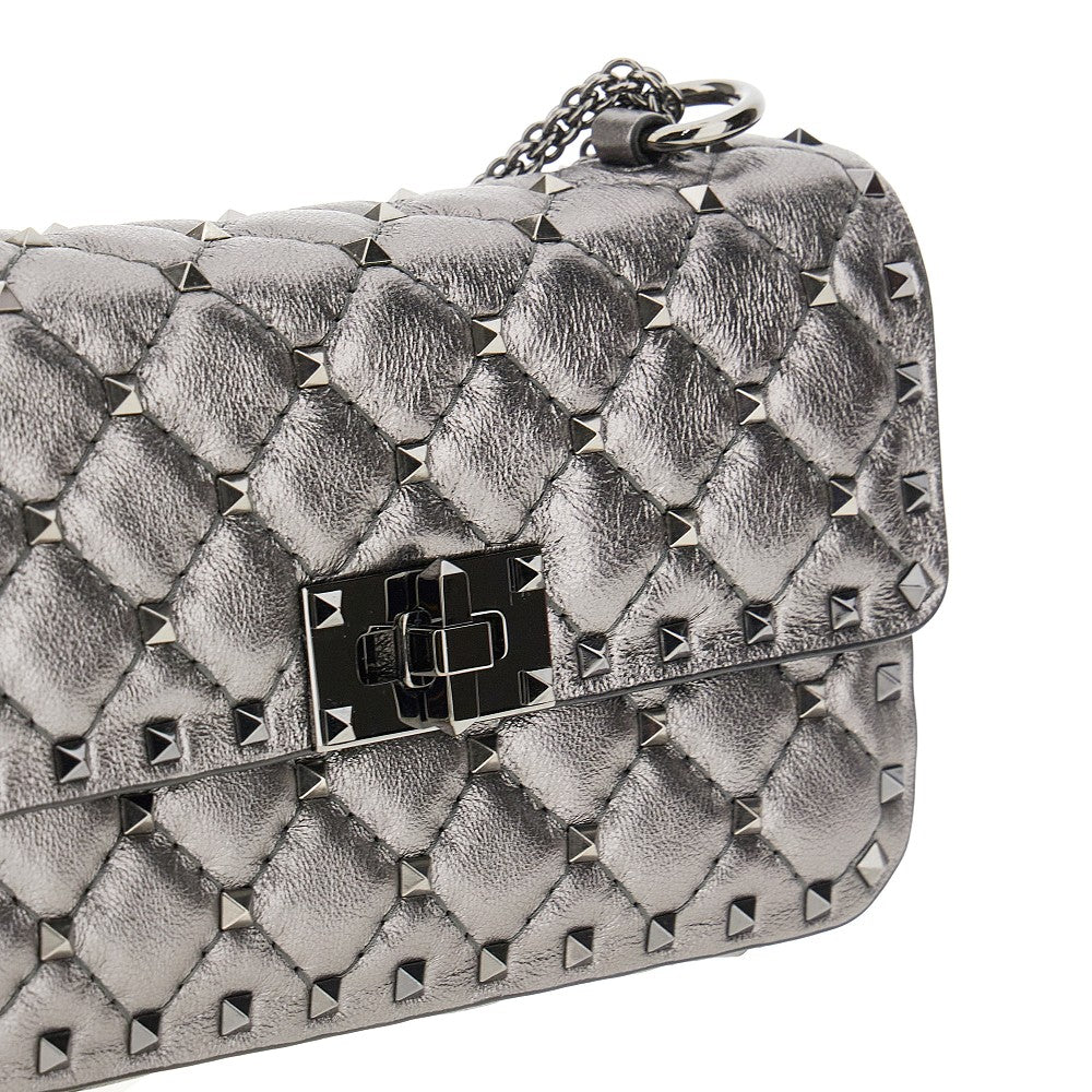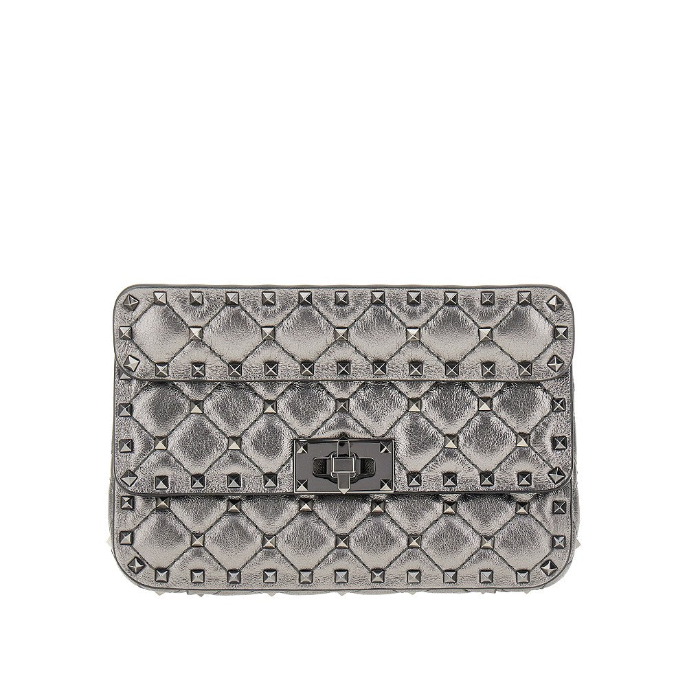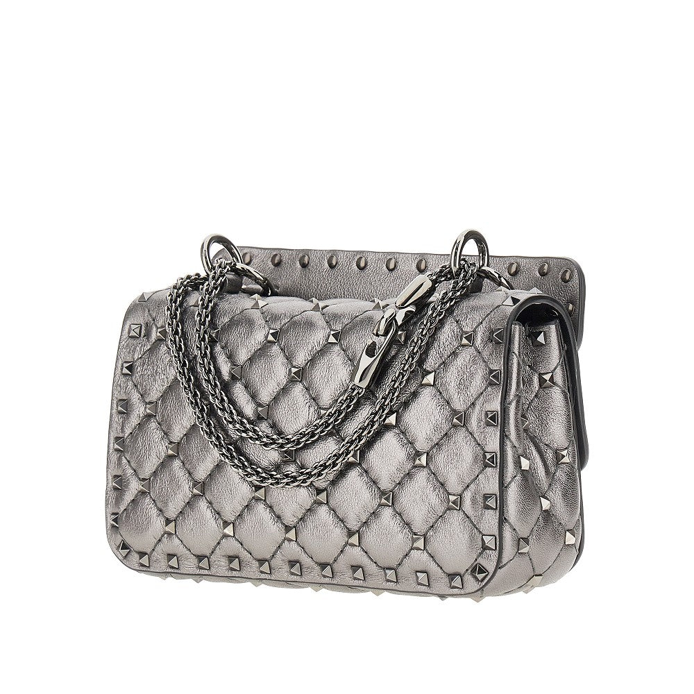 Bag made from metallized soft nappa leather, featuring diamond quilting enriched with signature Rockstud studs in ruthenium-finished metal. Both detachable flat handle and sliding chain strap. Flap with twist-lock closure. Nappa leather lining and one inner patch pocket.