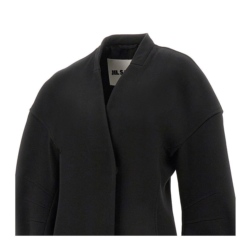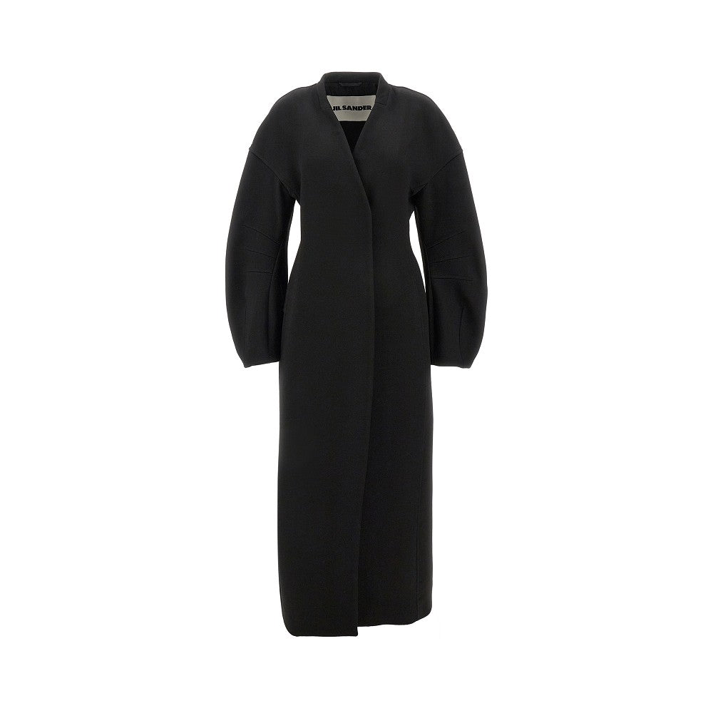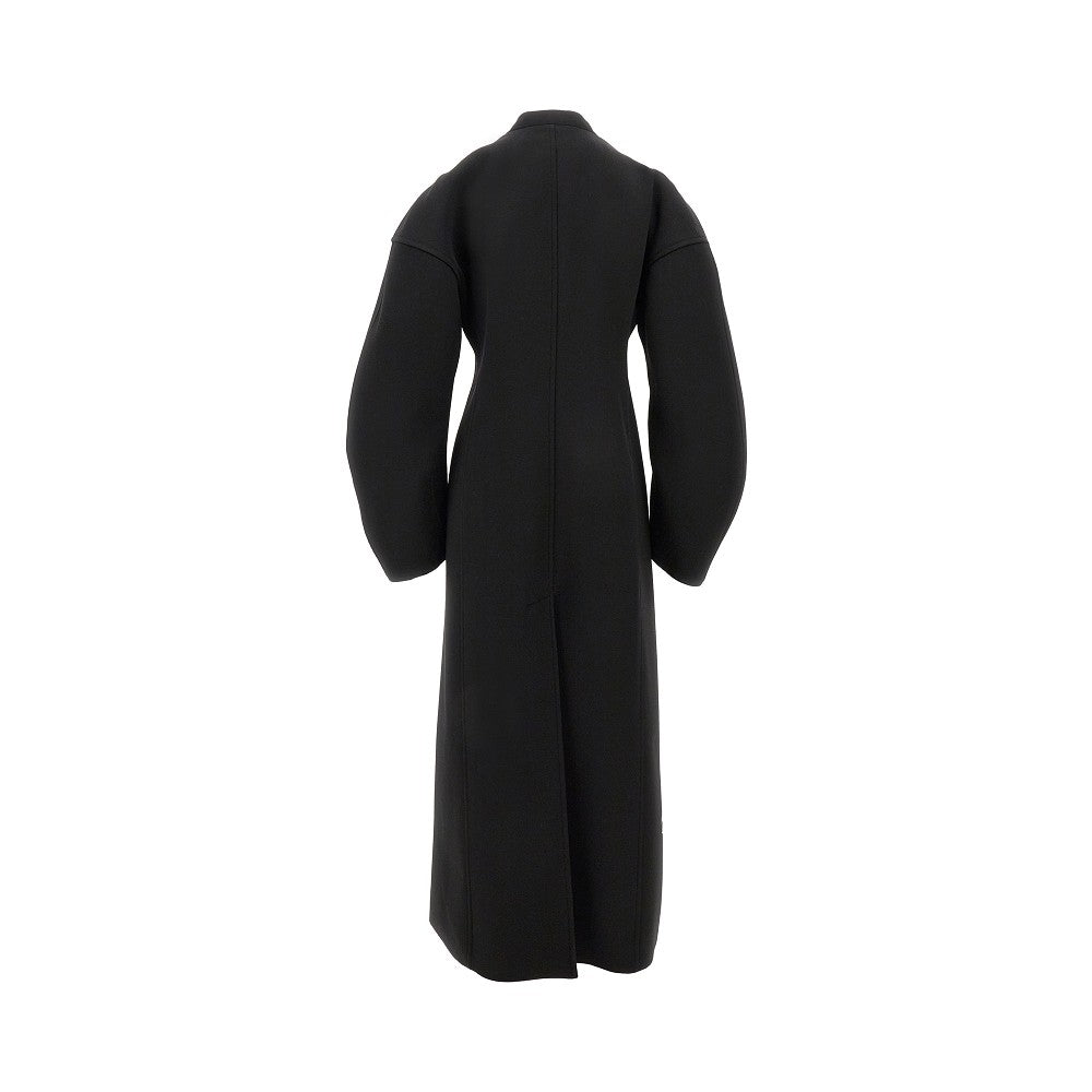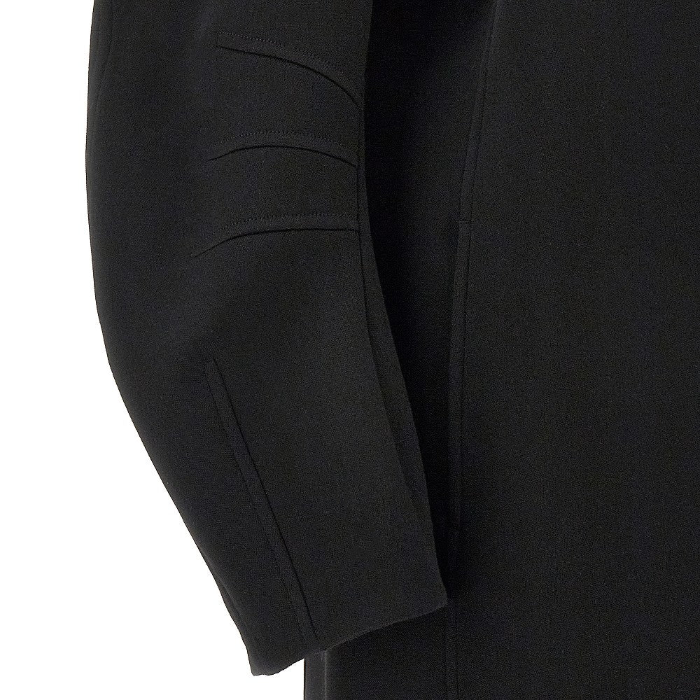 Long coat made from soft and compact wool jersey, featuring flared silhouette with fitted bodice and rounded sleeves with dropped shoulders. V-neck. Concealed closure with self-tie straps and press-studs. Side welt pockets. Lined.