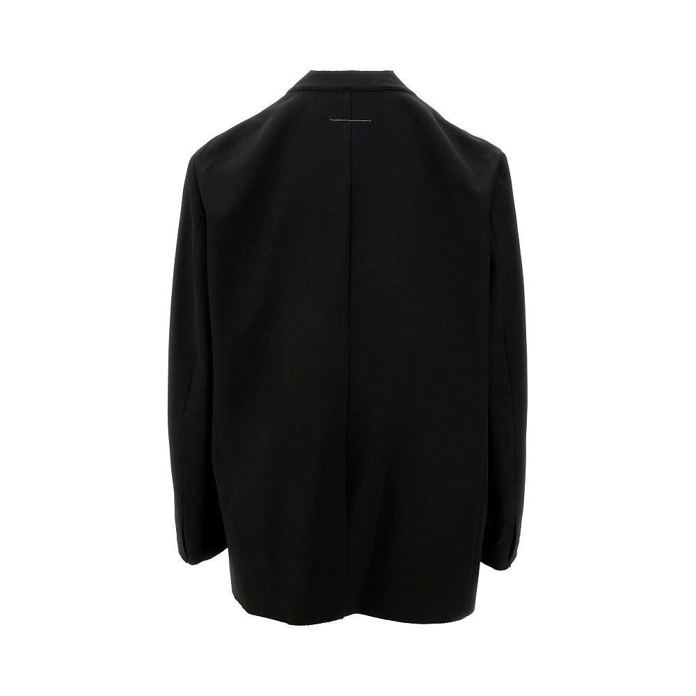 Jacket made from viscose-blend stretch gabardine, featuring raw-cut edges. Single-breasted closure with concealed snap-button and embroidered eyelets. V neckline with embroidered lapels. Decorative pockets with flap. Chest pocket. Rear split. Oversized fit. Unlined.