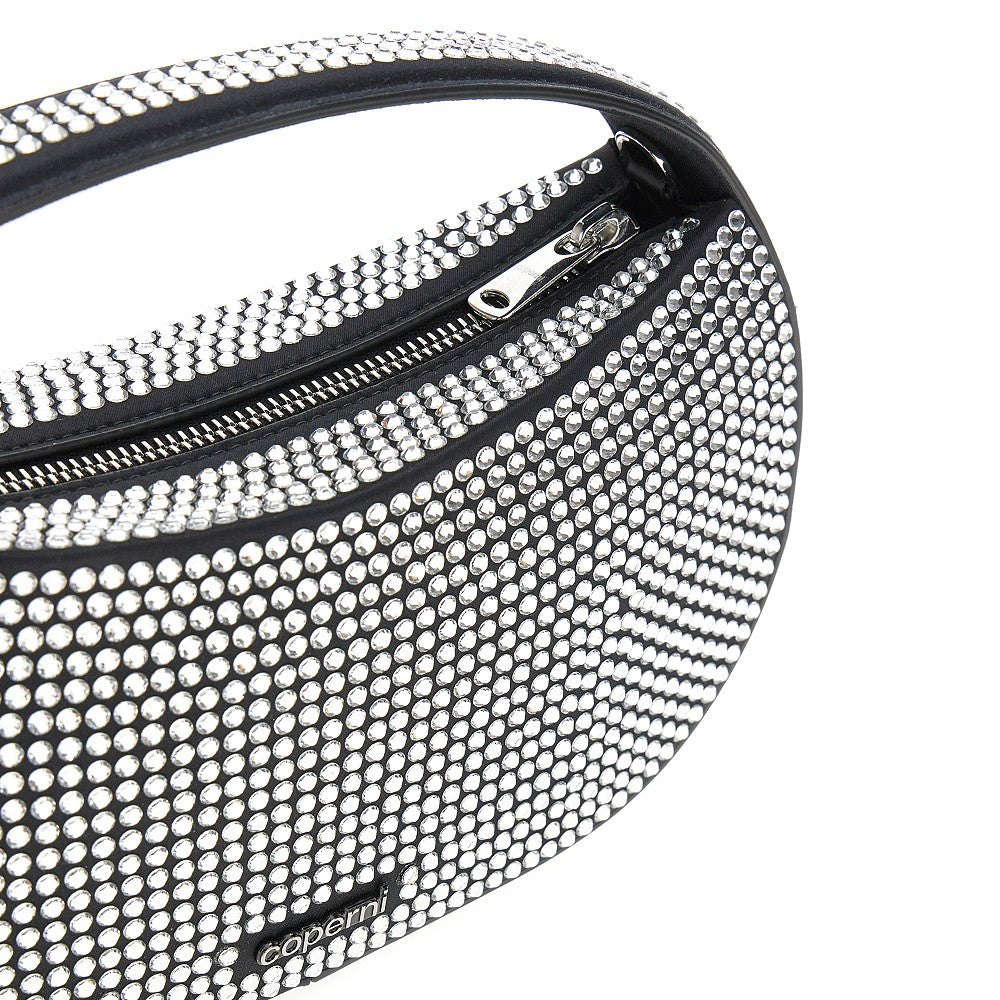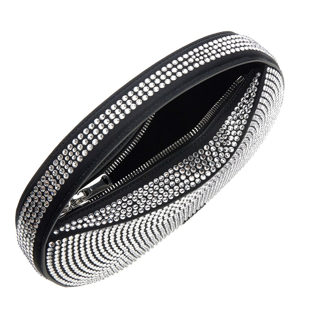 Bag made from satin with all-over hotfix rhinestones, featuring rounded shape inspired by a personal music player. Silver-tone metal lettering logo on front. Flat top handle. Equipped with detachable satin shoulder strap. Silver-finished metal zip closure. Leather lining.