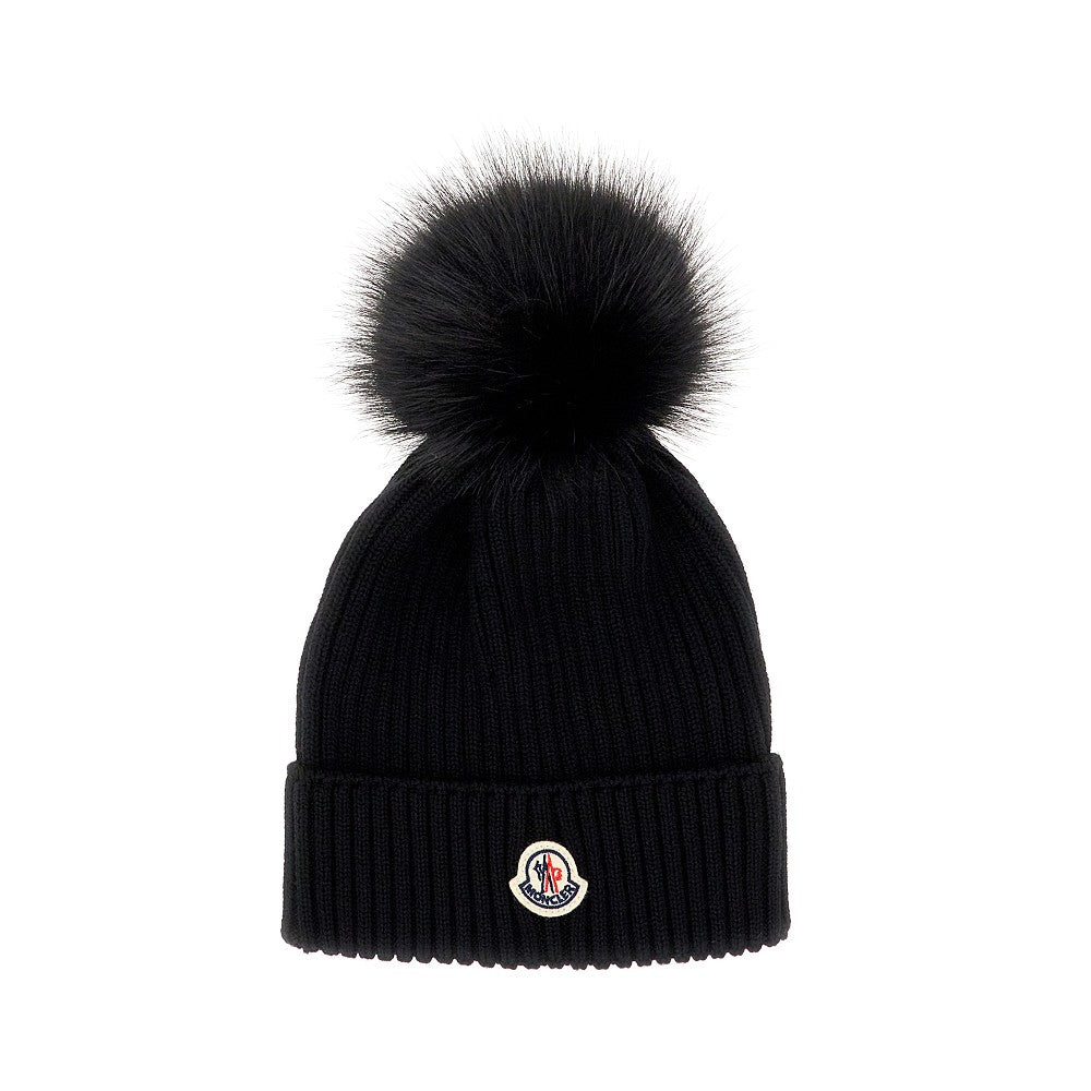 Beanie hat made from pure wool virgin wool ribbed knit, enriched with faux fur pompom and felt logo patch on the cuff.