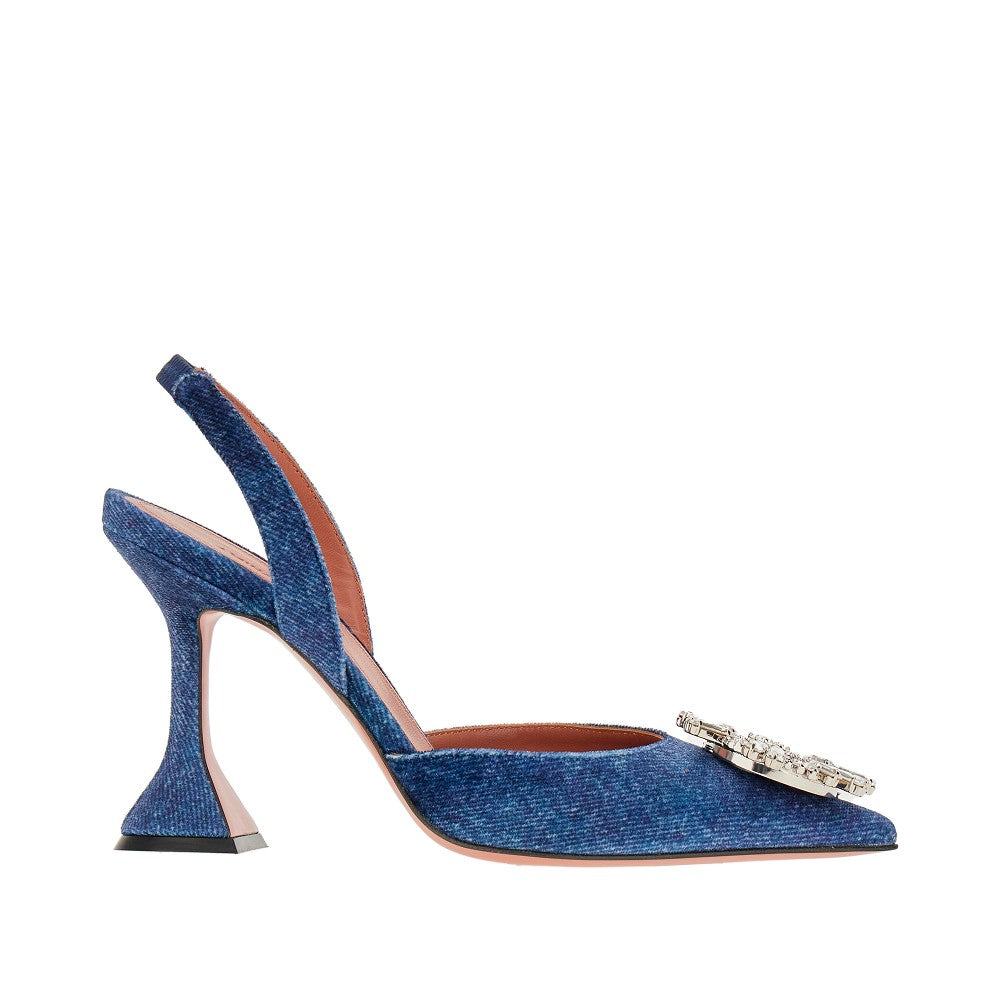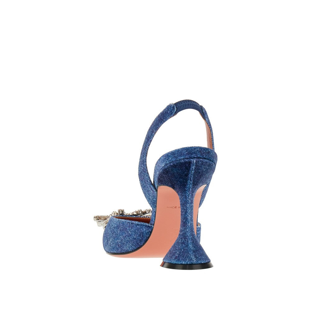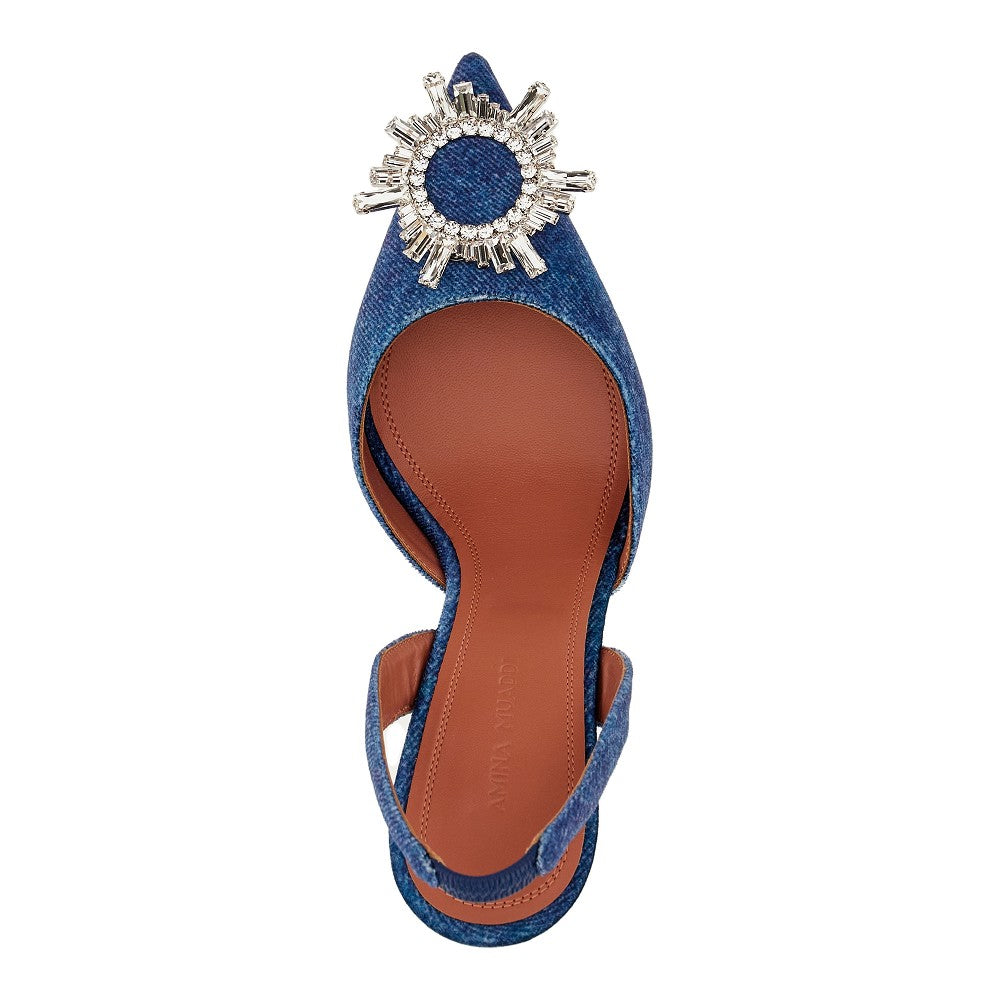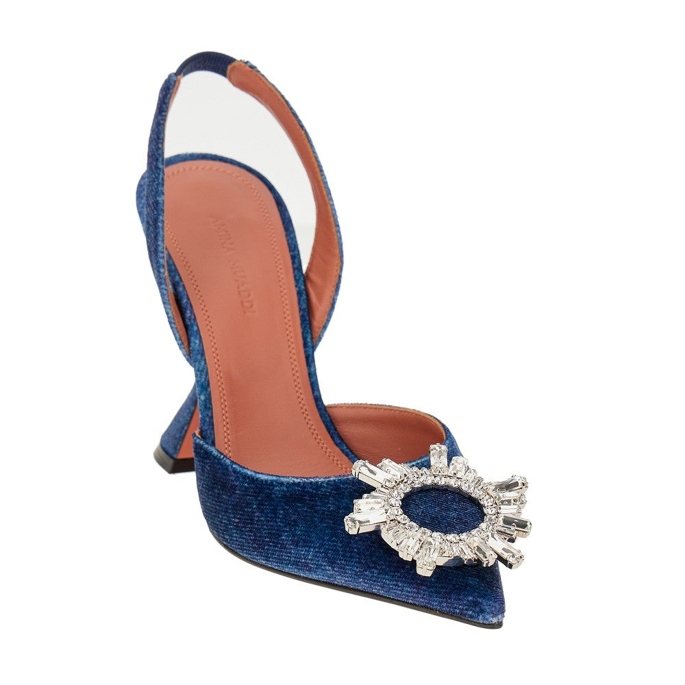 Begum pointed-toe slingback pumps made from denim-print velvet, enriched with crystal buckle on the toe. Velvet-covered signature hourglass heel. Leather insole. Leather sole with rubber inlay.
