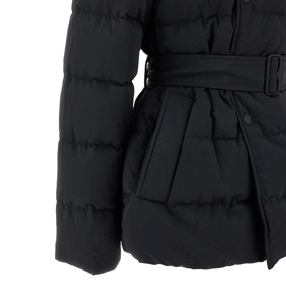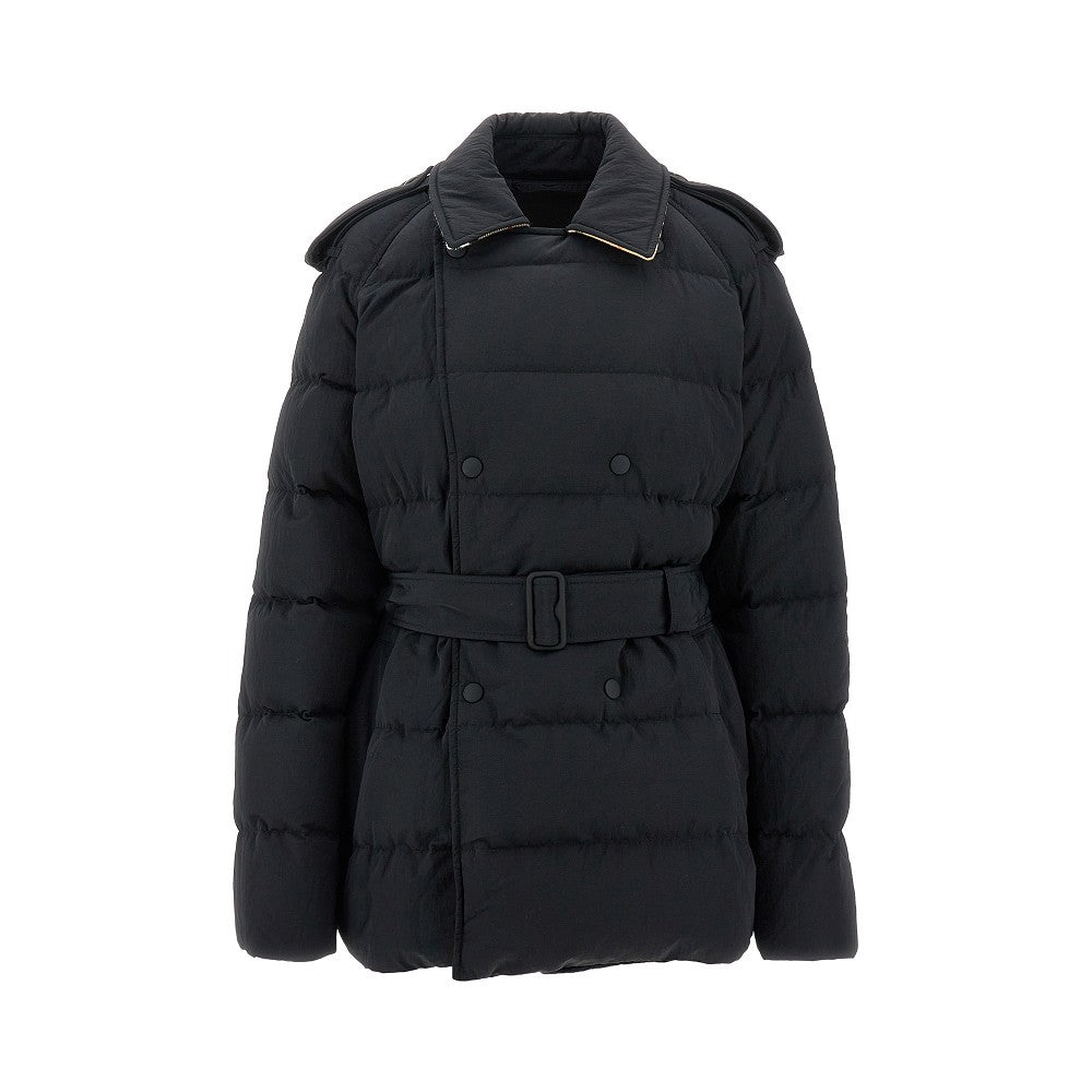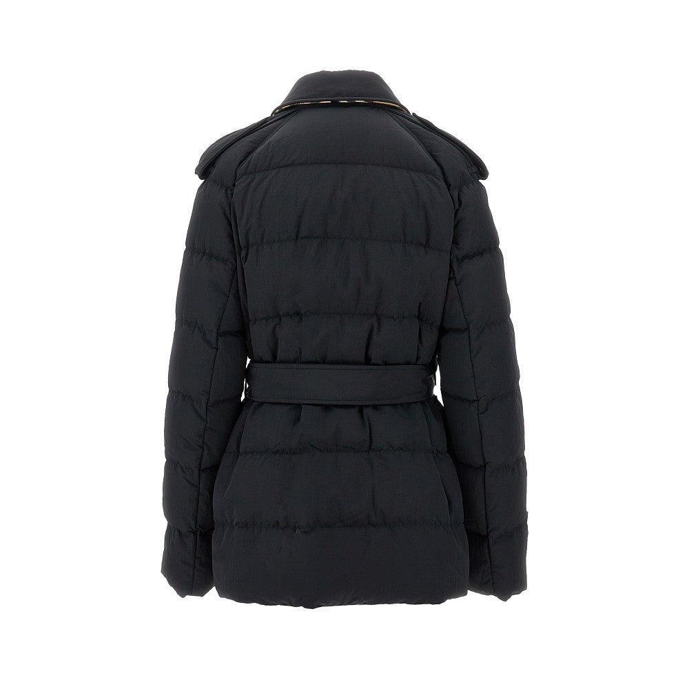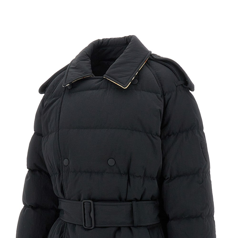 Down Jacket made from quilted soft nylon with goose down padding, featuring lined-wool collar with signature Burberry Check motif. Double-breasted buttons closure. Side welt pockets with press-stud. Shoulder epaulettes and detachable matching belt.