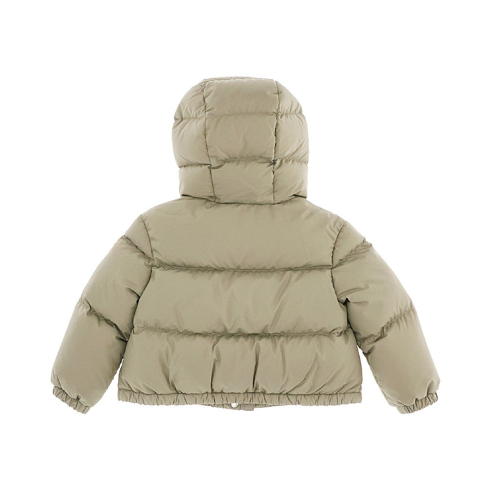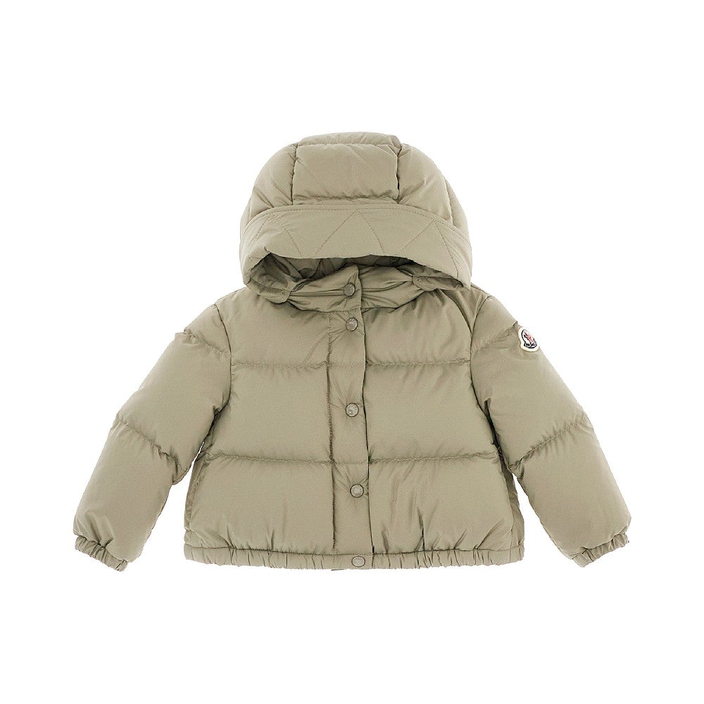 Hooded down jacket made from soft recycled technical fabric with goose down padding. Zip and press-studs closure. Side inseam pockets concealed press-stud closure. Elasticated cuffs and bottom hem. Logo patch on the left sleeve.