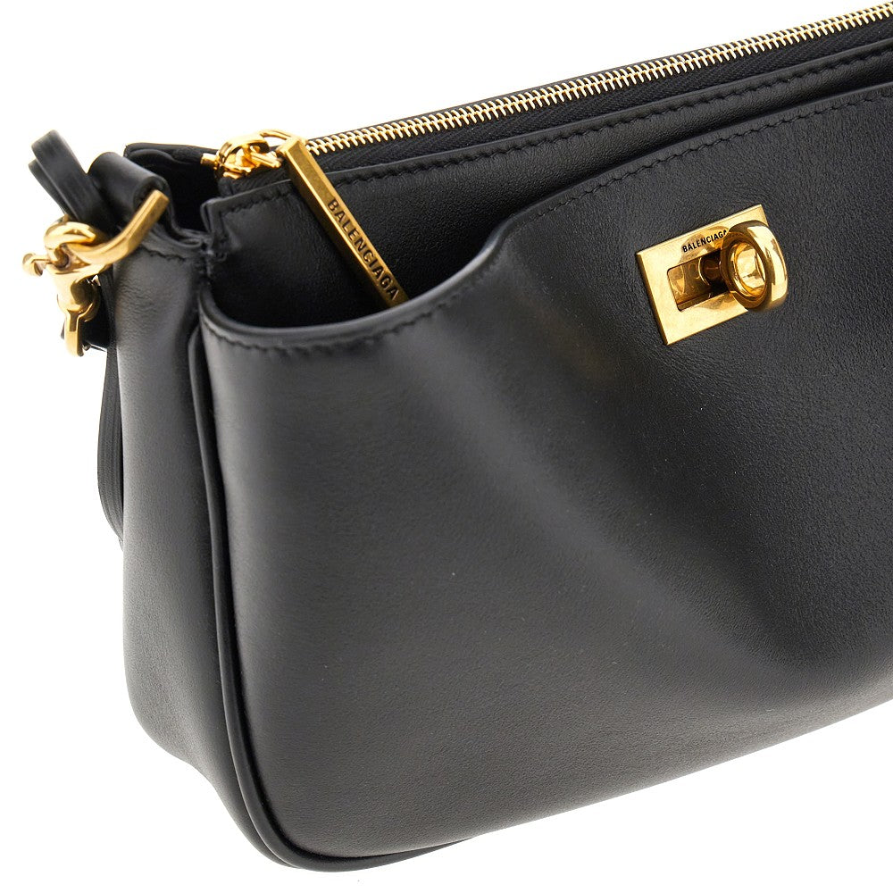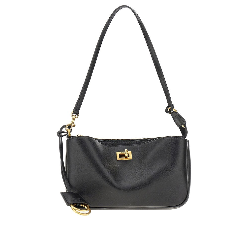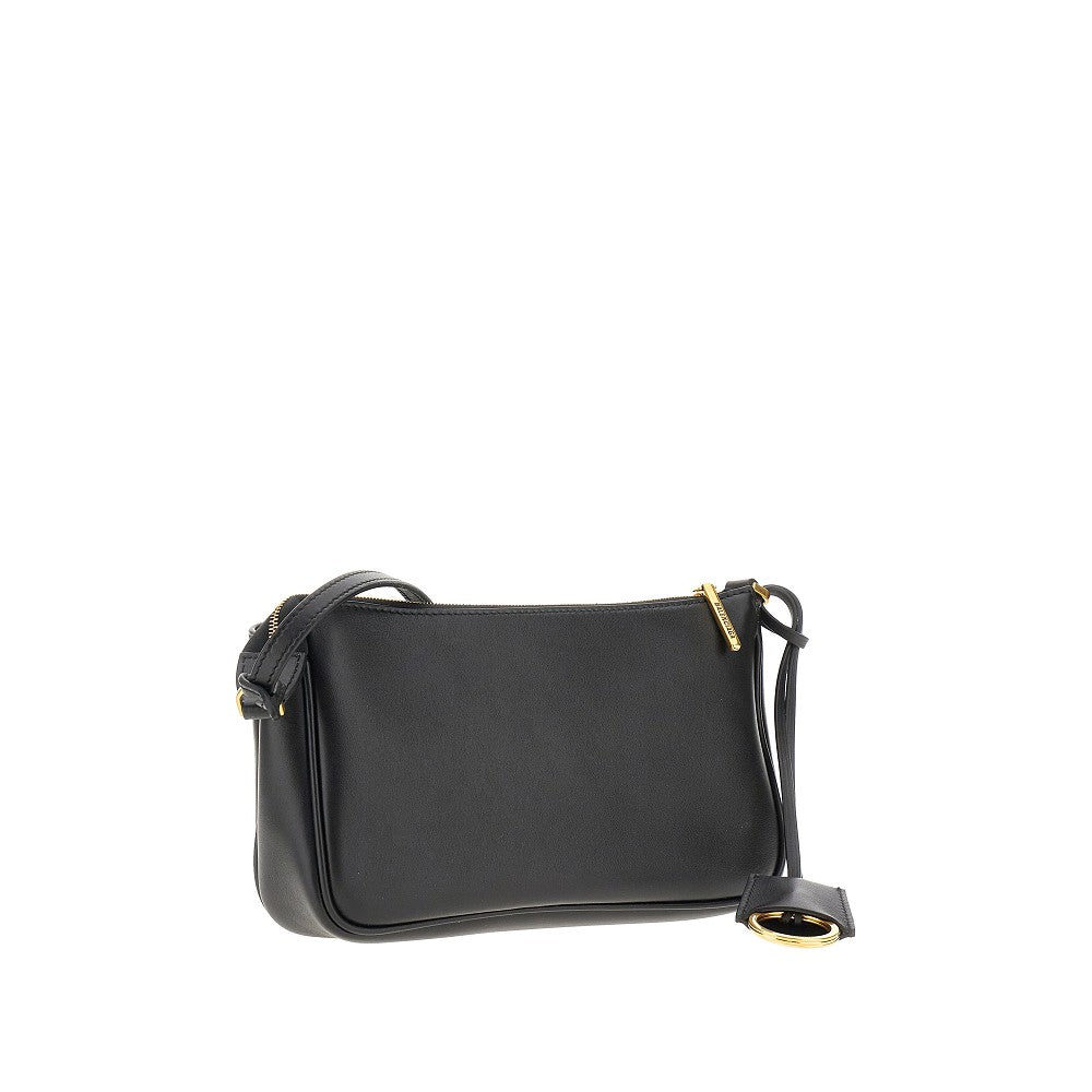 Bag made from soft smooth leather, featuring front pocket with gold-finished metal twist-lock closure with engraved logo. Equipped with detachable strap to carry on the shoulder. Removable pendant with double key-ring. Zip closure. Nappa leather lining and three inner card slots.