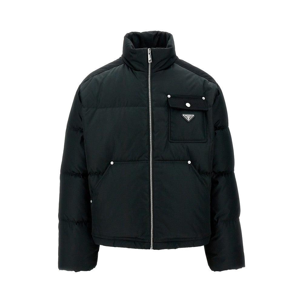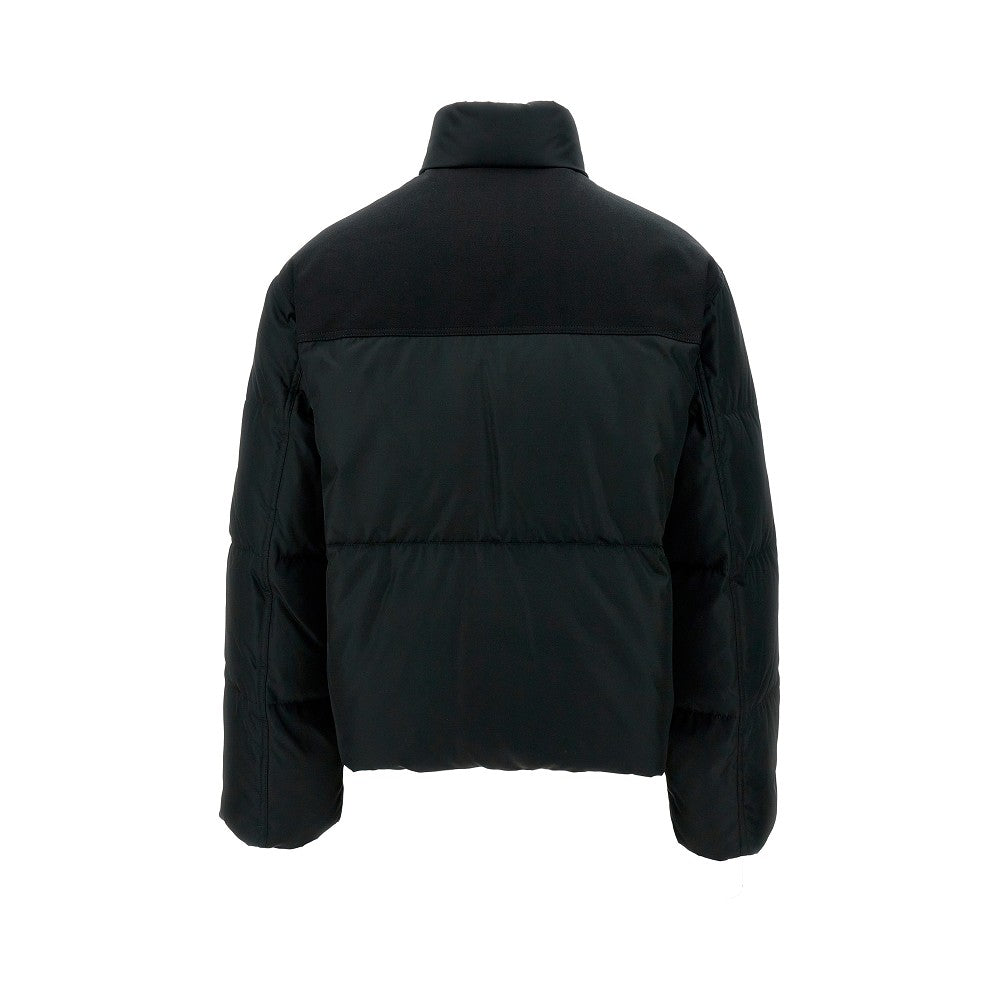 Jacket made from regenerated nylon canvas with goose down padding, featuring cotton gabardine yoke and pocket flap. Chest patch pocket with button-down flap and leather triangle patch with enamel and metal logo plate. Zip closure, standing collar and side patch pockets. Boxy fit.