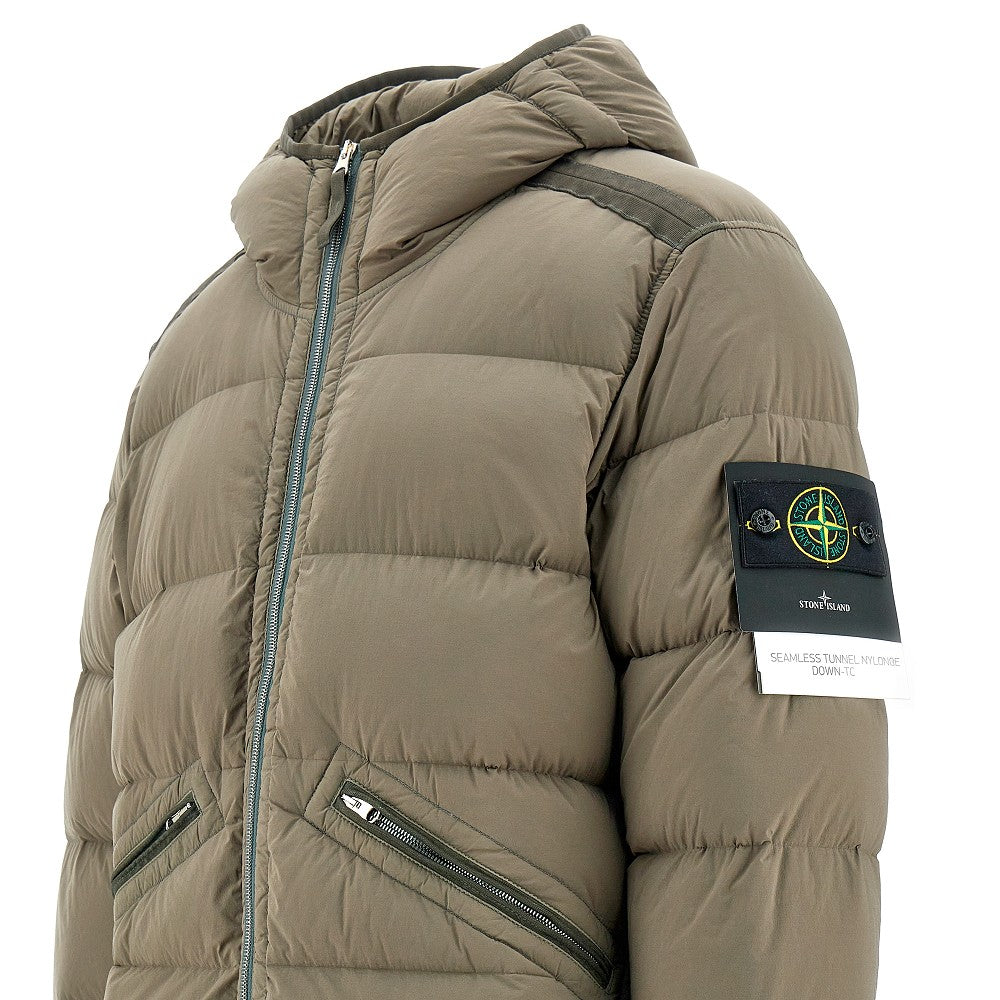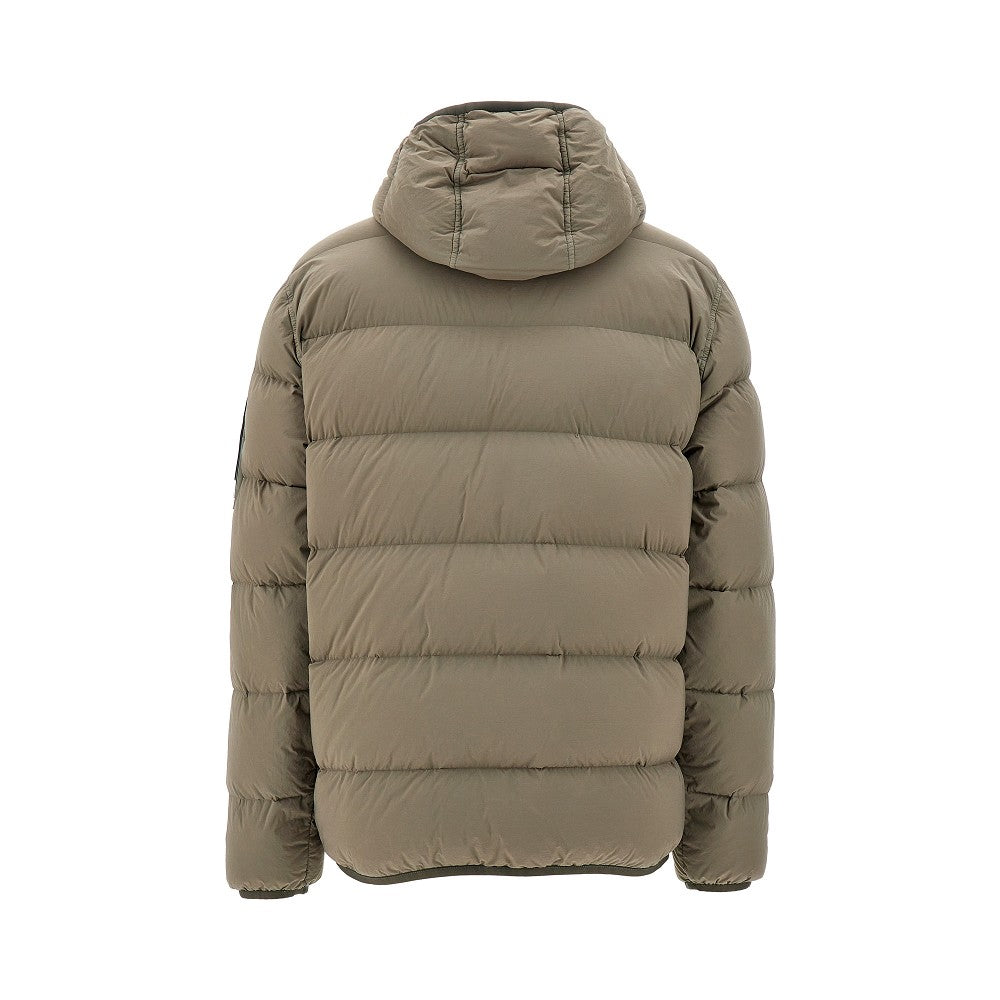 Short down jacket made from garment-dyed light stretch one-layer nylon with no-seams quilting, anti-drop treatment and goose down padding. Double-way zip closure, hooded neck, side zippered welt pockets and elastic trims. Signature felt logo badge on the left sleeve.