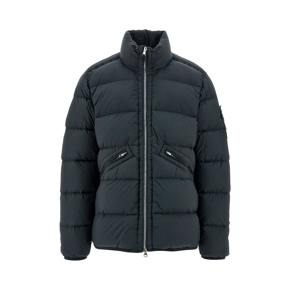Short down jacket made from garment-dyed light stretch one-layer nylon with no-seams quilting, anti-drop treatment and goose down padding. Double-way zip closure, standing collar, side zippered welt pockets and elastic trims. Signature felt logo badge on the left sleeve.