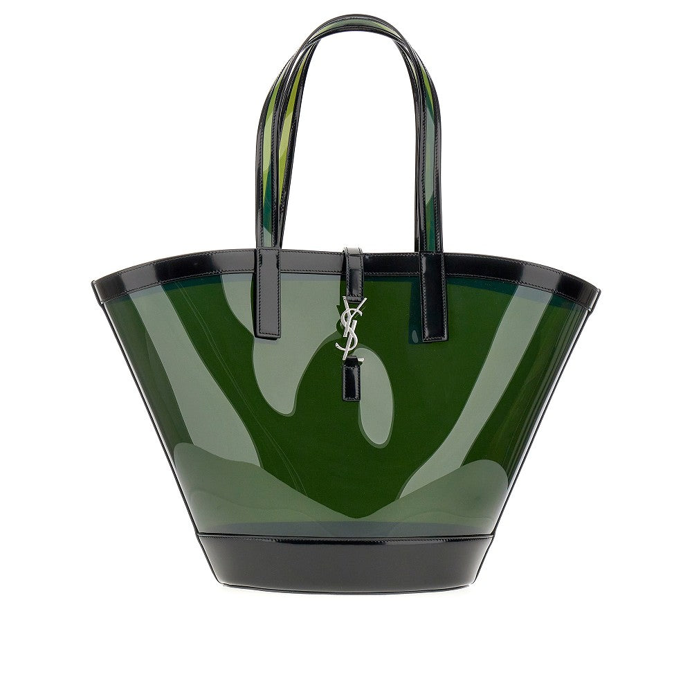 Medium Panier bag made from transparent vinyl with shiny leather details, featuring silver-finished metal Cassandre hook closure. Top handles to carry by hand or on the shoulder. Unlined.