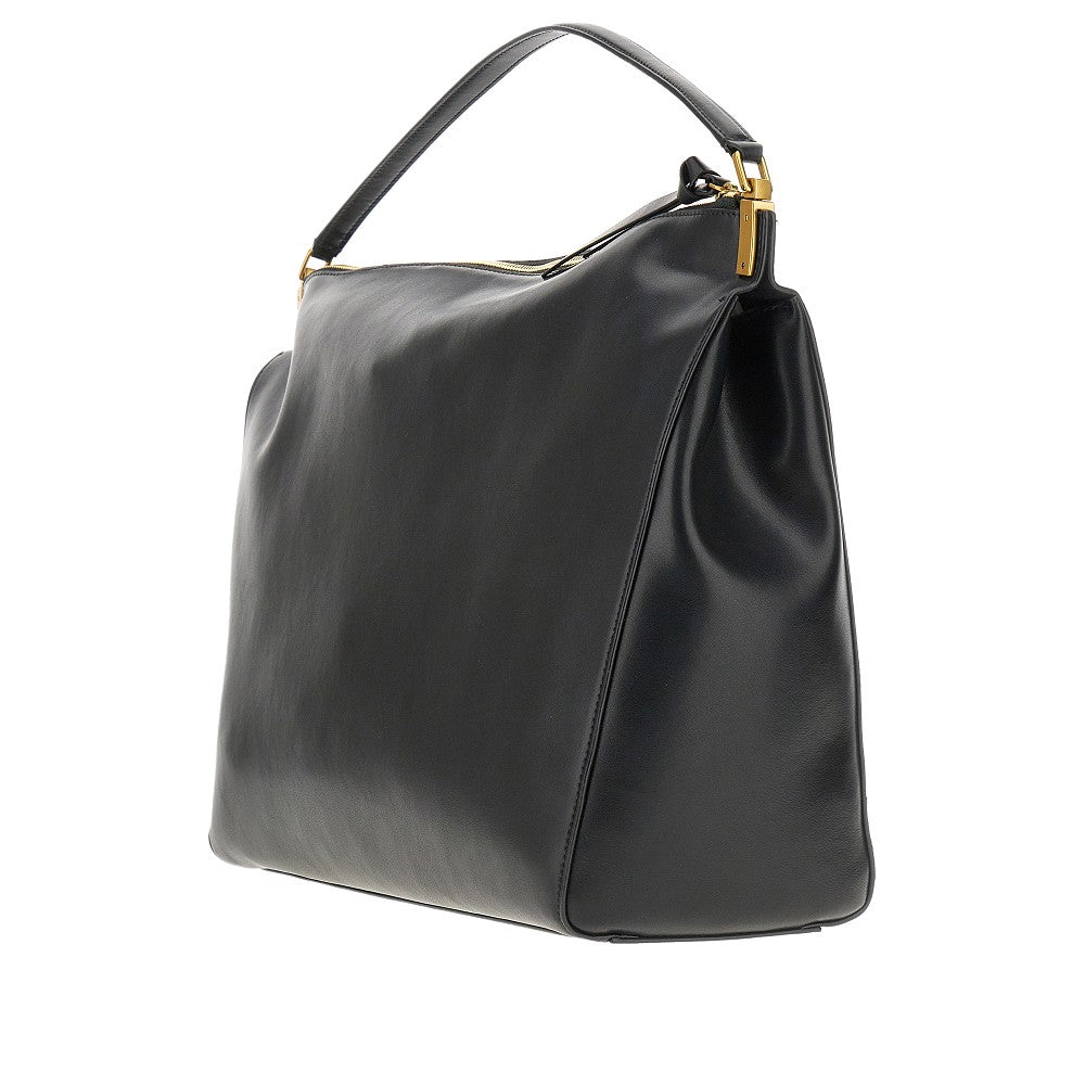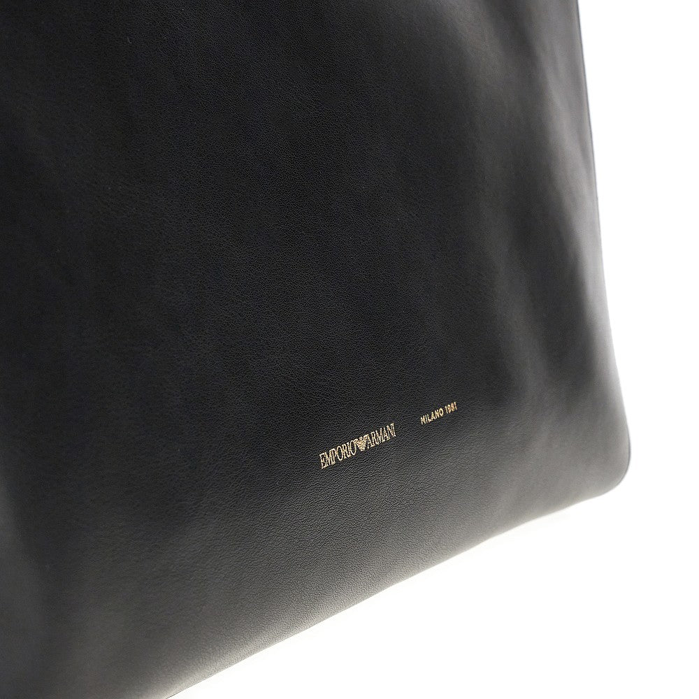 Borsa realizzata in morbida pelle liscia con manico da indossare a mano o a spalla. Logo "Emporio Armani Milano 1981" dorato stampato sul davanti. Chiusura con zip. Interno foderato in suedette con una tasca applicata. Accessori metallici con finitura oro anticato.