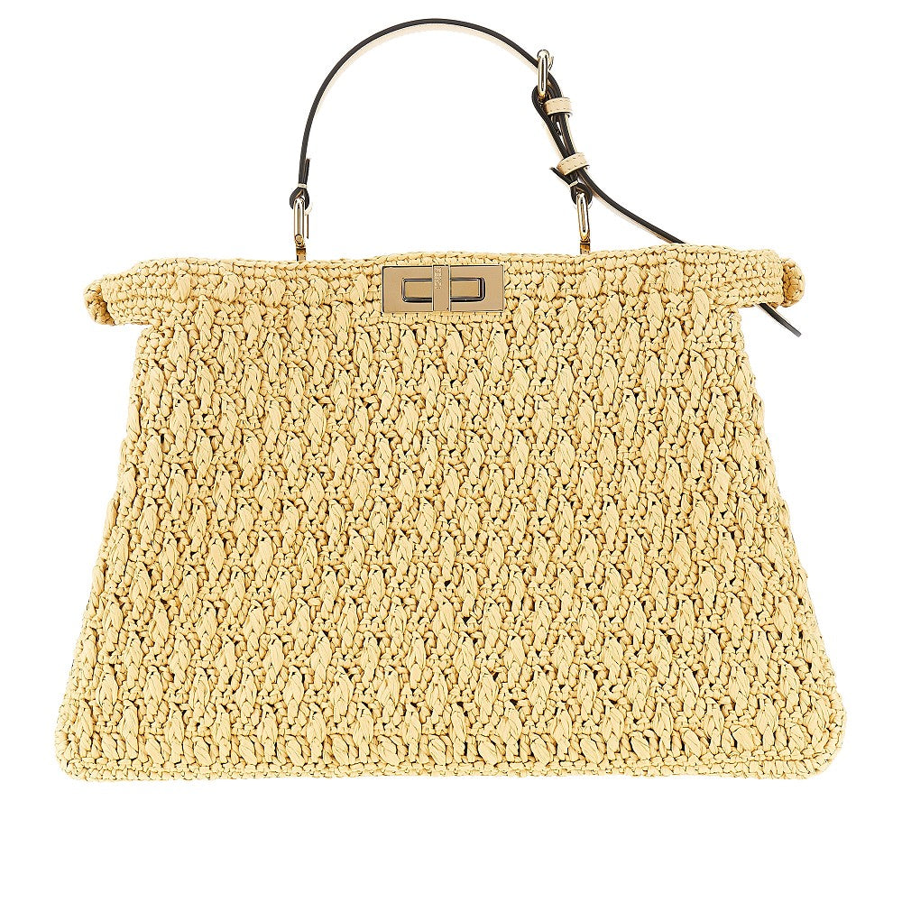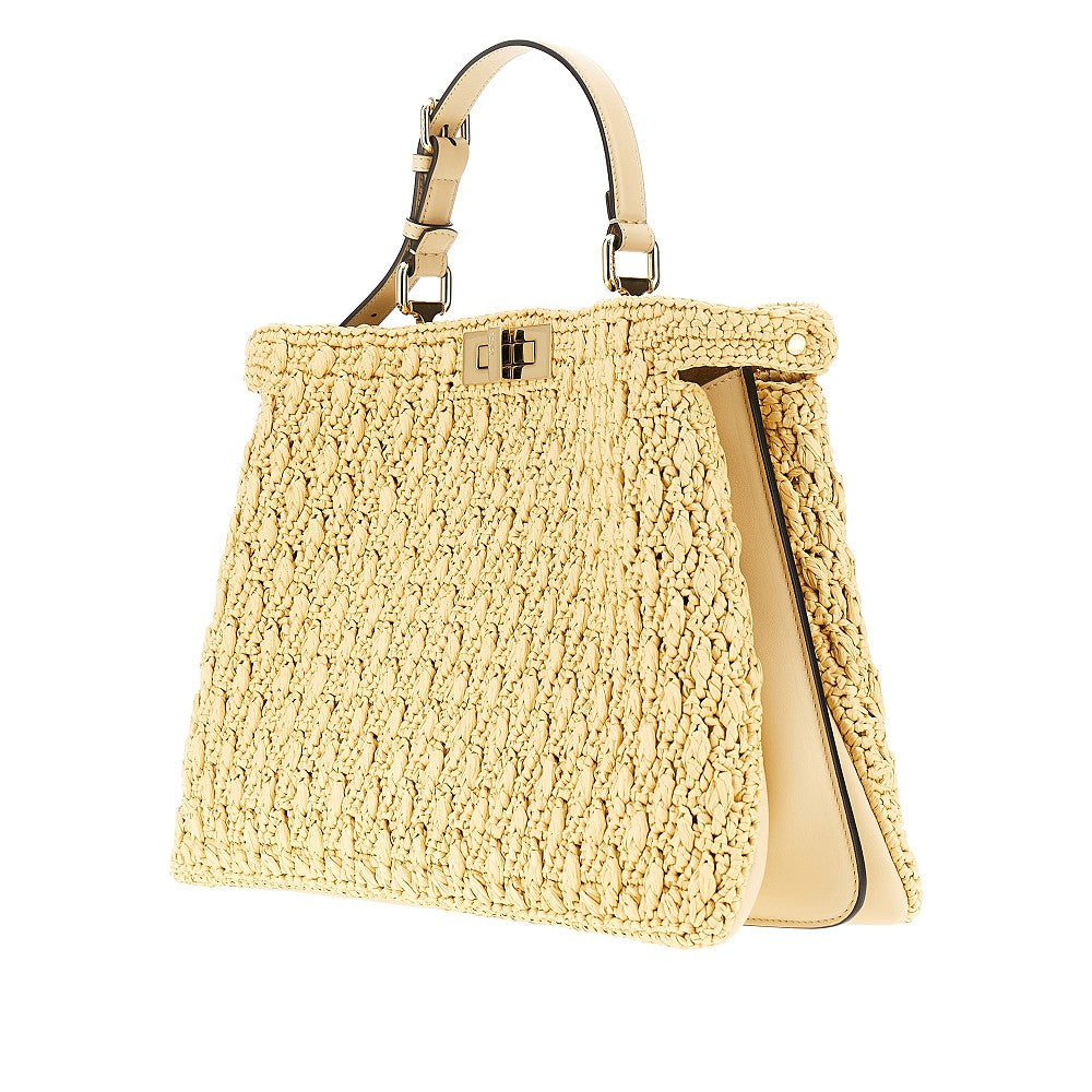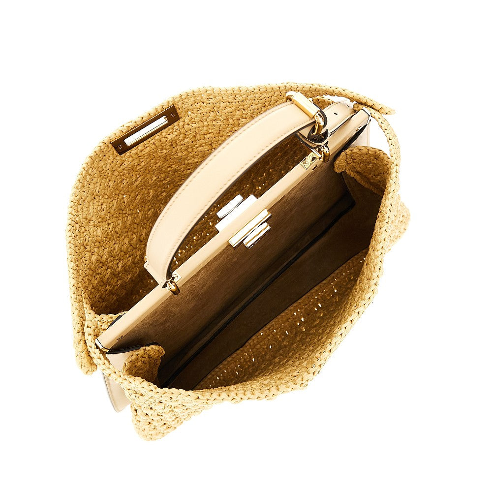Borsa in fibra di viscosa intrecciata a mano, caratterizzata dall'iconica chiusura twist-lock su entrambi i lati. Manico regolabile in pelle da indossare a mano o sulla spalla. Interno sfoderato e organizzato in due scomparti. Una tasca a toppa interna in pelle. Accessori metallici con finitura oro.