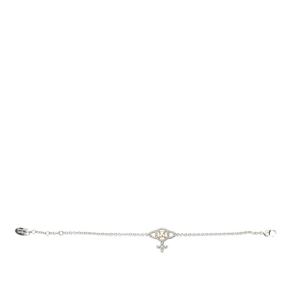 Bracciale realizzato in ottone finitura argento, caratterizzato dal dettaglio Orb arricchito da cristalli di zirconia cubica incastonati e da una perla in vetro. Chiusura regolabile con moschettone.