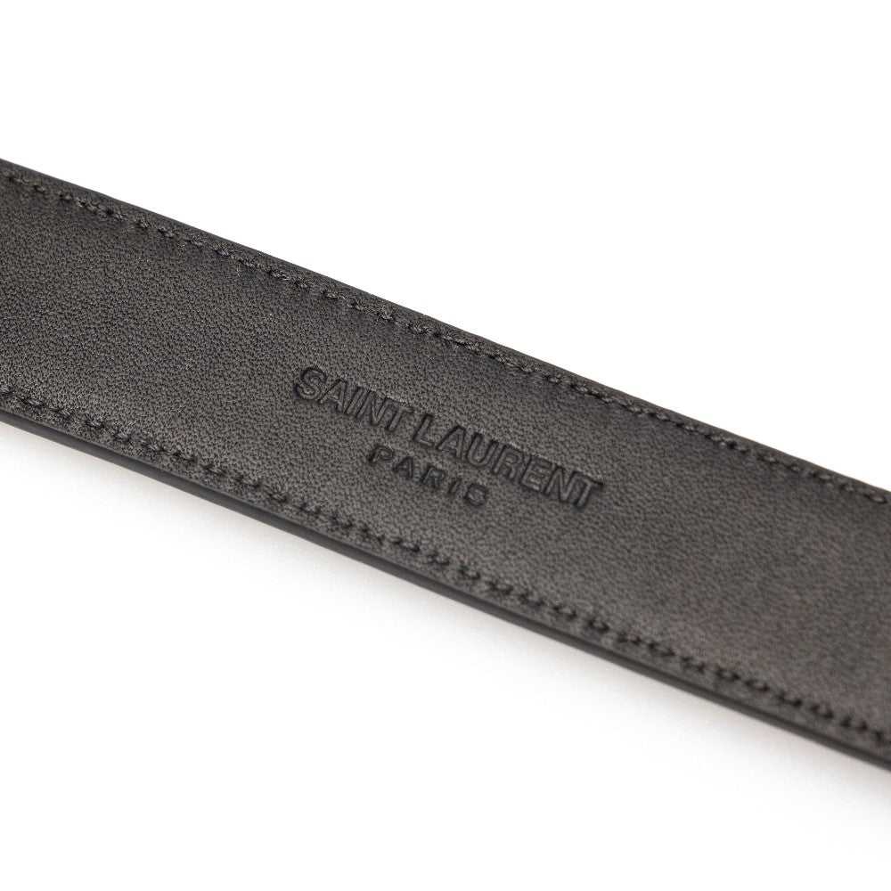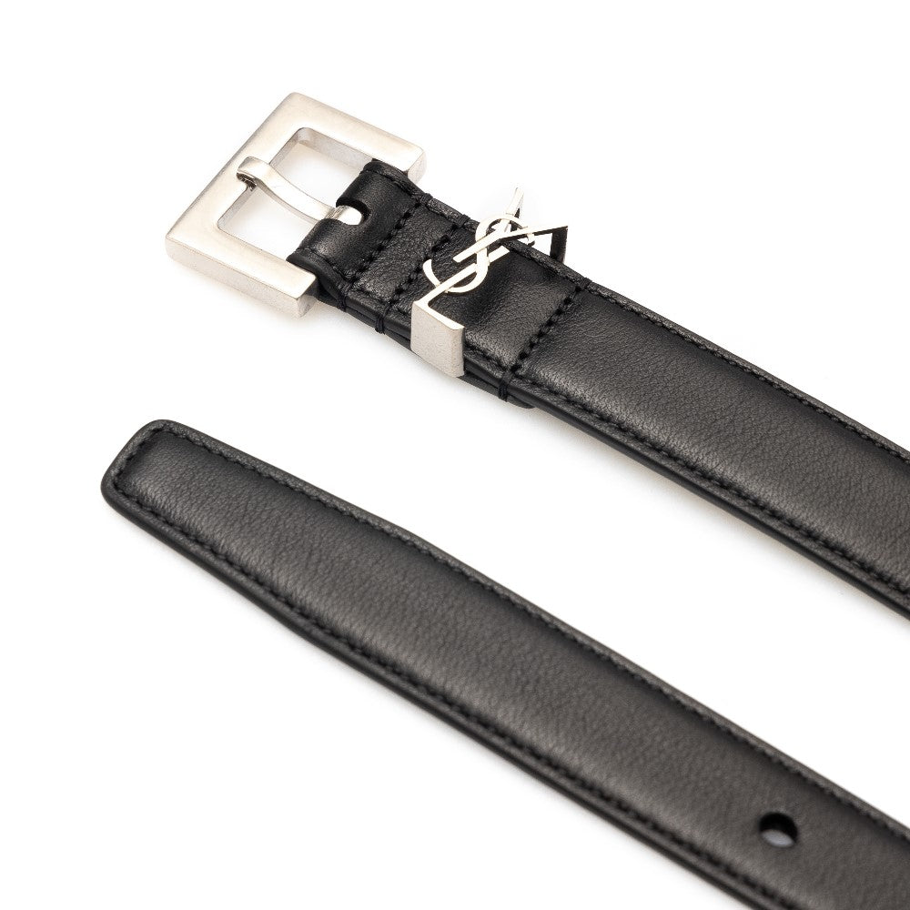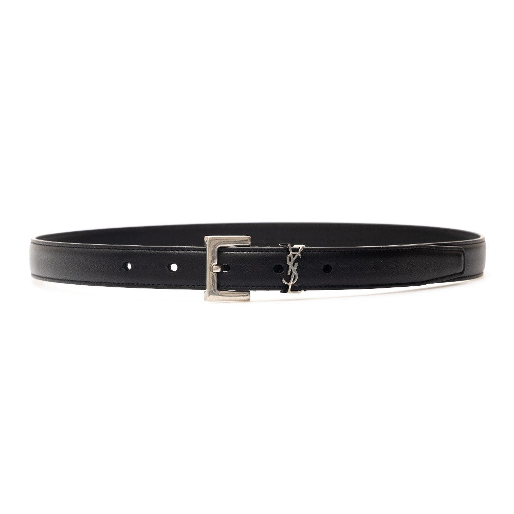 Cintura realizzata in morbida pelle, caratterizzata dalla fibbia quadrata e dal passante YSL in metallo finitura argento.