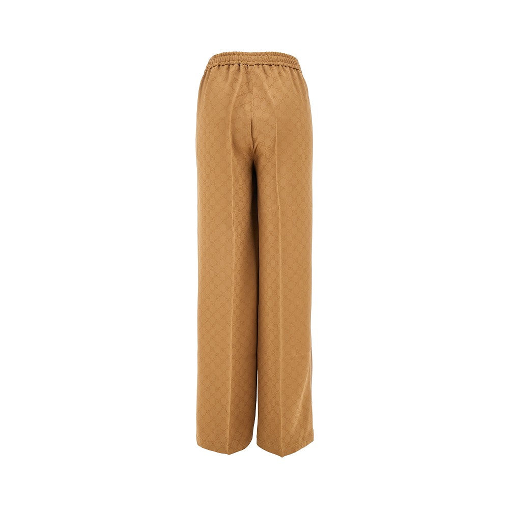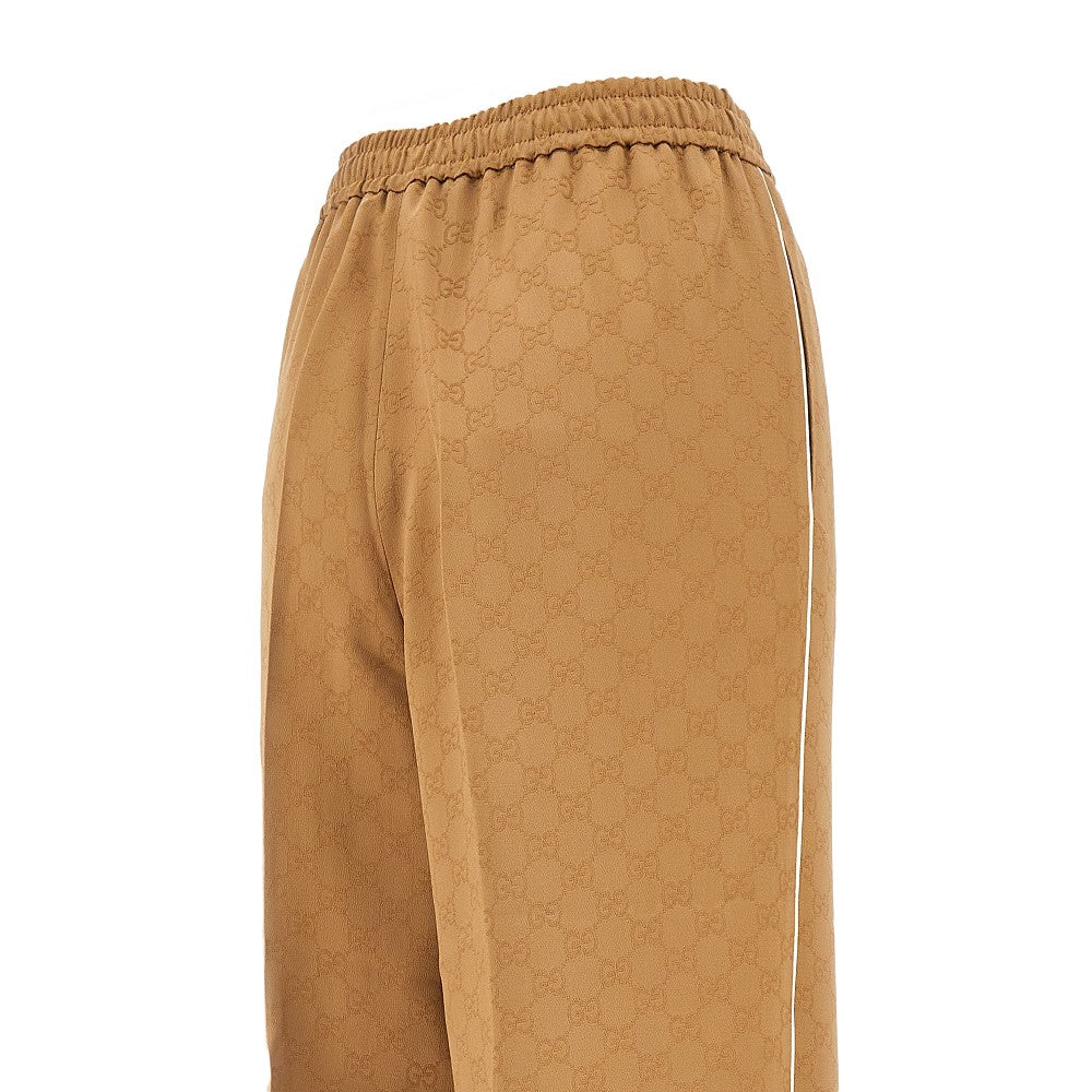 Pantalone sportivo realizzato in tessuto di misto viscosa dal finish lucido con motivo GG in jacquard all-over e piping a contrasto sui lati. Vita elasticizzata con coulisse interna. Vestibilità rilassata con gamba dritta e ampia. Tasche laterali a filetto.