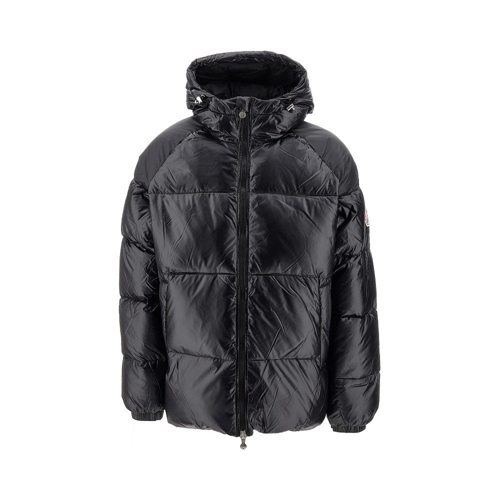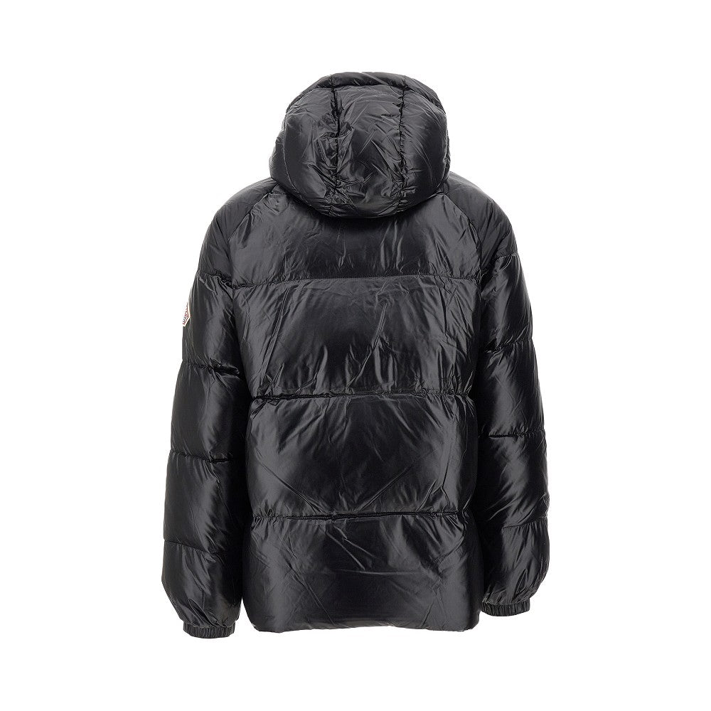 Piumino corto realizzato in nylon lucido resistente ad acqua e vento con imbottitura in piuma e trapuntatura orizzontale. Chiusura zip a doppio cursore, cappuccio con coulisse elastica, maniche raglan con polsini elastici e tasche a filetto con zip a scomparsa. Patch logo sulla manica sinistra.