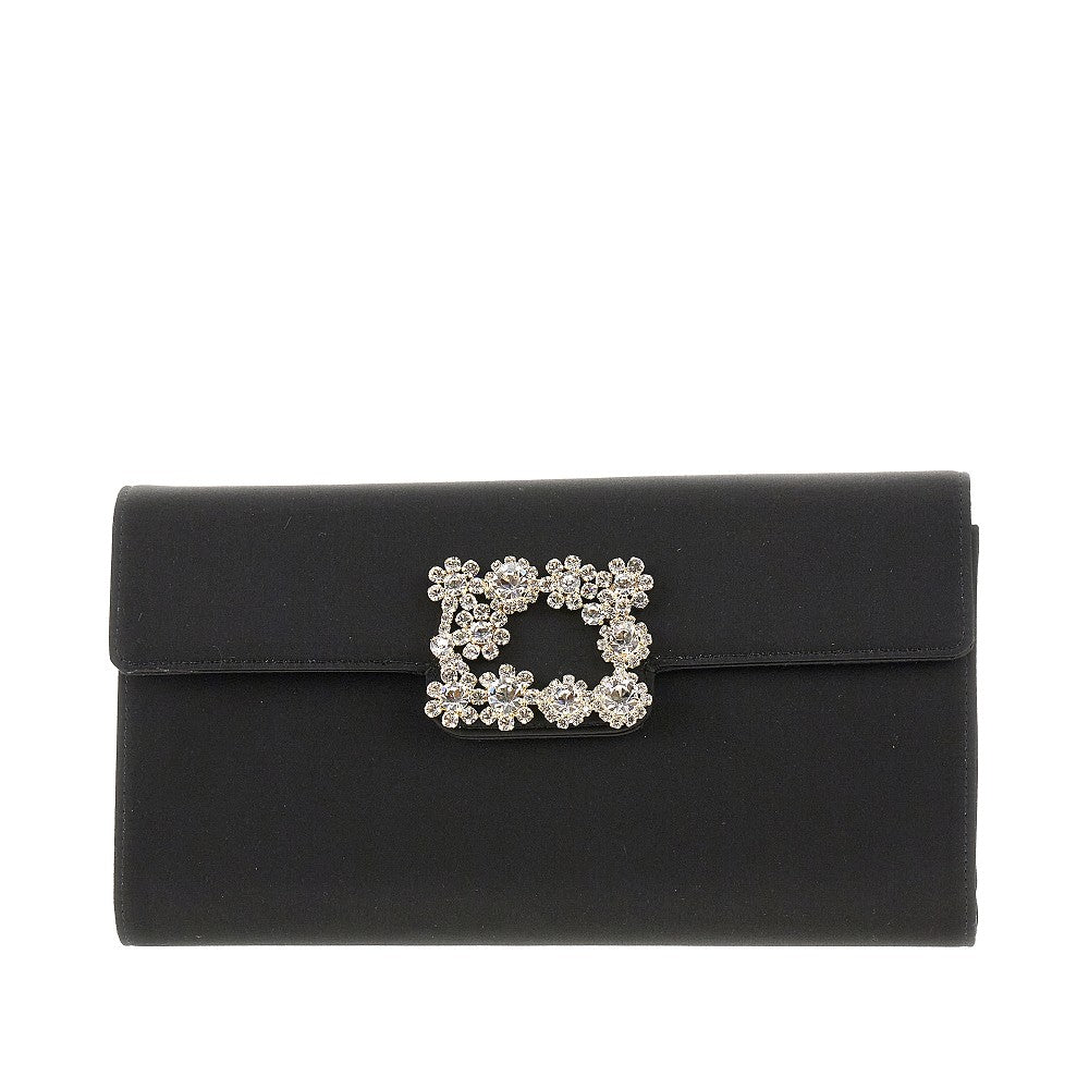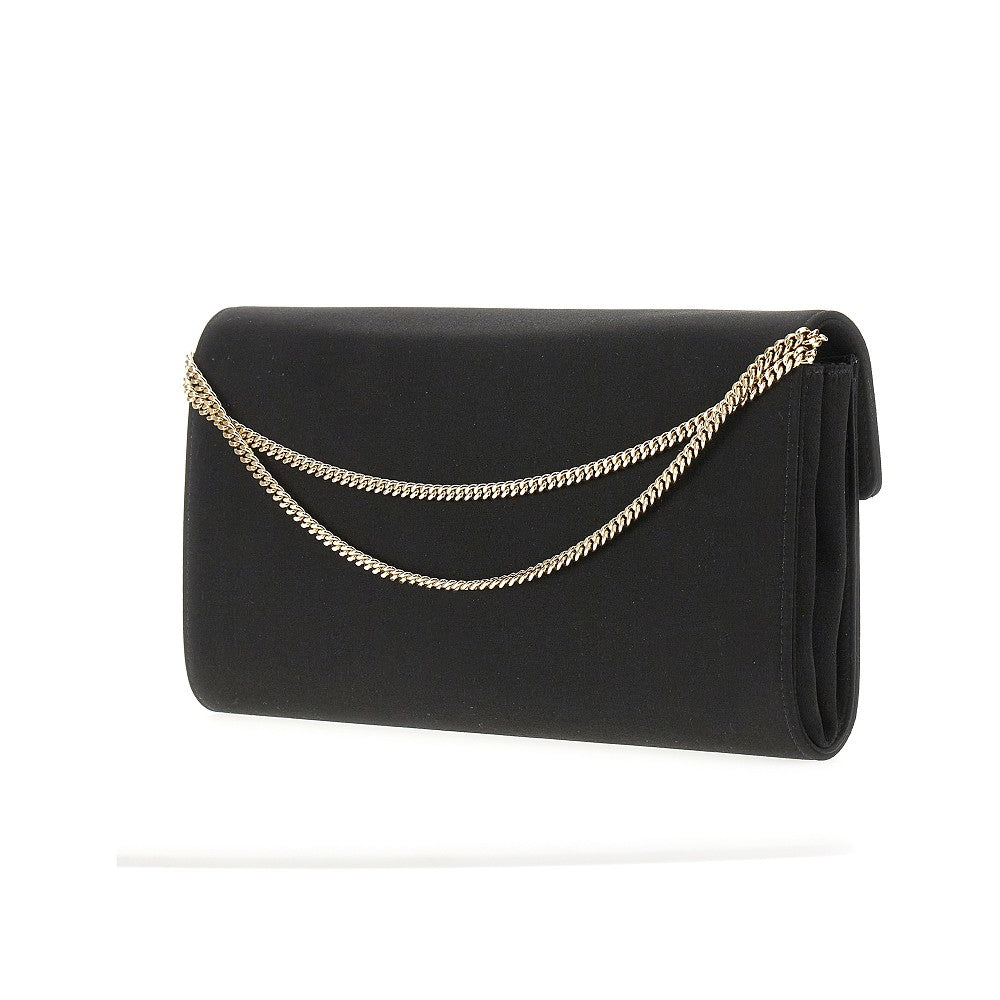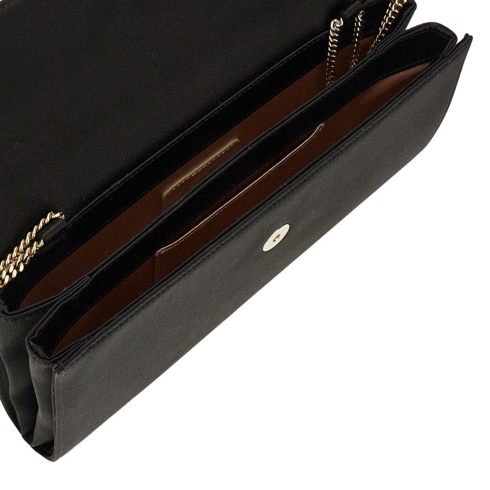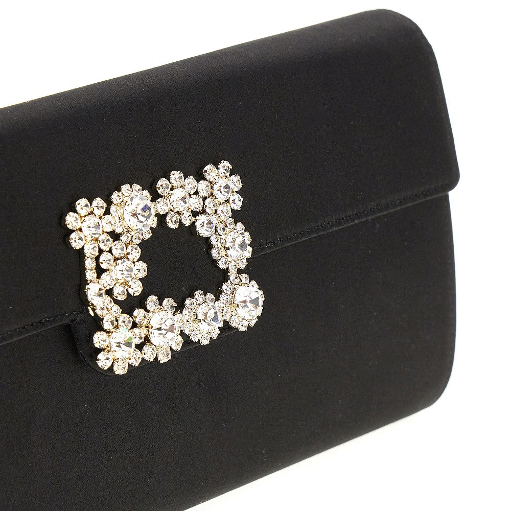 Pochette in raso di misto seta, caratterizzata dalla pattina con chiusura magnetica arricchita dalla fibbia floreale in metallo dorato con cristalli. Può essere indossata a mano oppure crossbody grazie alla tracollina scorrevole in catena. Interno in raso con due scomparti e una taschina a toppa.
