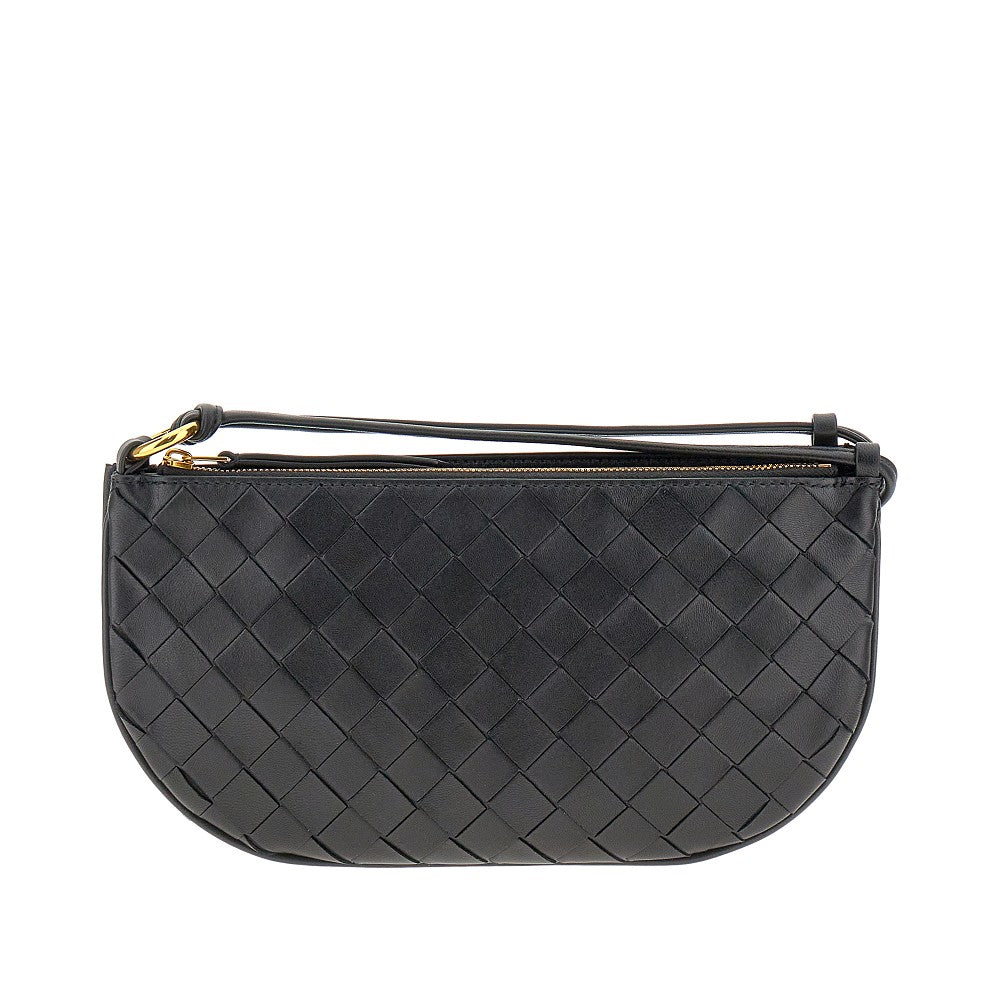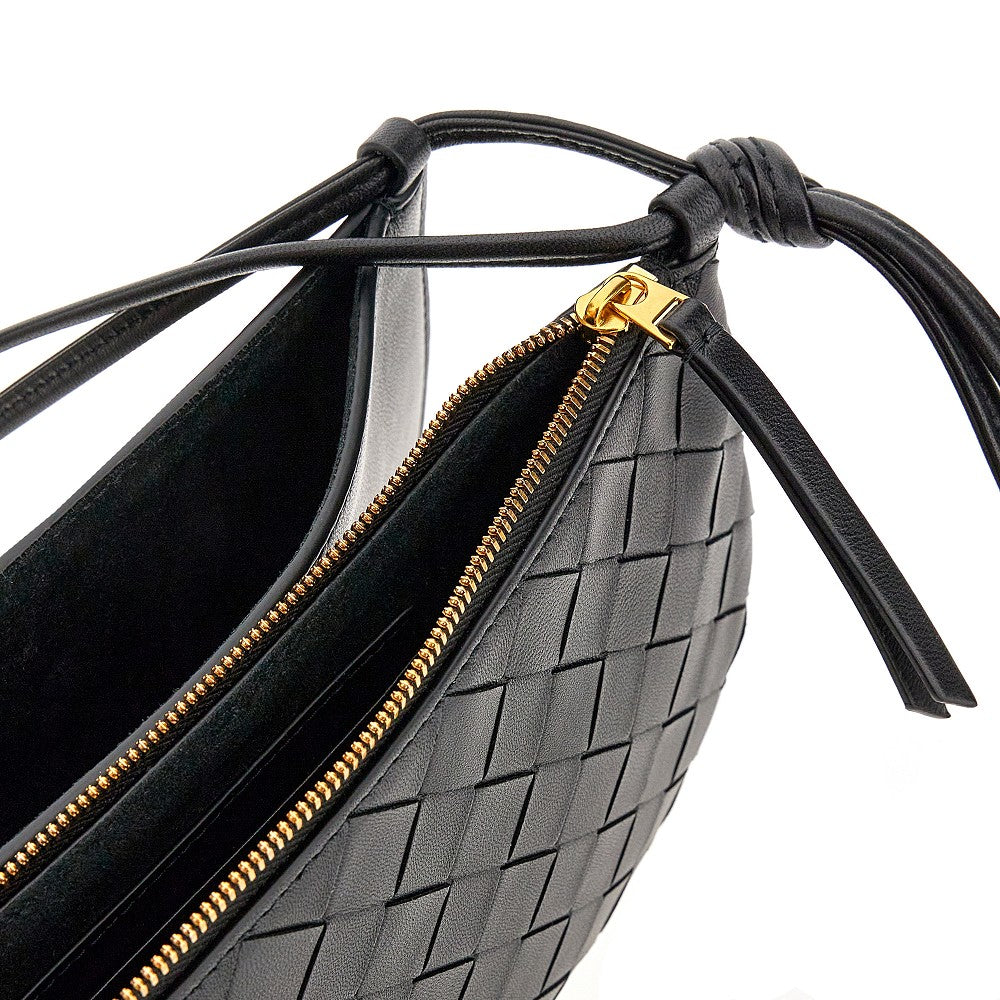Borsa a spalla composta da due pouch, uno in nappa liscia con chiusura magnetica e uno con l'iconica lavorazione Intrecciato. Manico con dettaglio annodato. Il pouch frontale è caratterizzato da chiusura con zip e interno scamosciato con due slot portacarte.