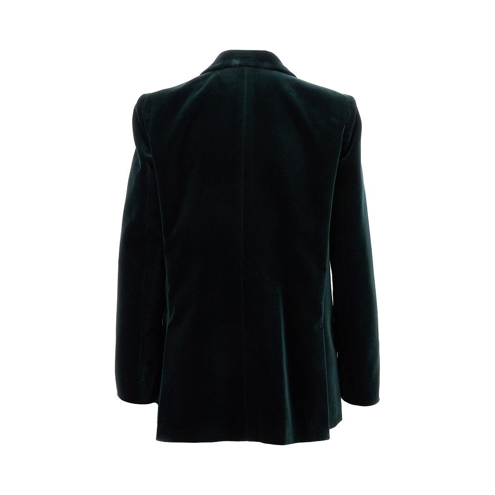 Blazer realizzato in velluto di cotone, caratterizzato dal taglio maschile e leggermente oversize con spalle imbottite. Chiusura doppiopetto con bottoni, revers a lancia, tasca profilata sul petto, spacchi laterali sul retro e iconiche tasche laterali a filetto arrotondate con bottone. Foderato.