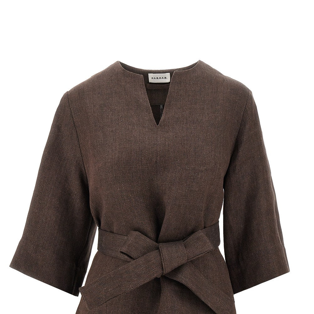 Blusa realizzata in gabardine di puro lino, accessoriata di fusciacca abbinata da annodare sul busto. Silhouette rilassata con maniche a 3/4, scollo a V e spacchetti laterali sul fondo.