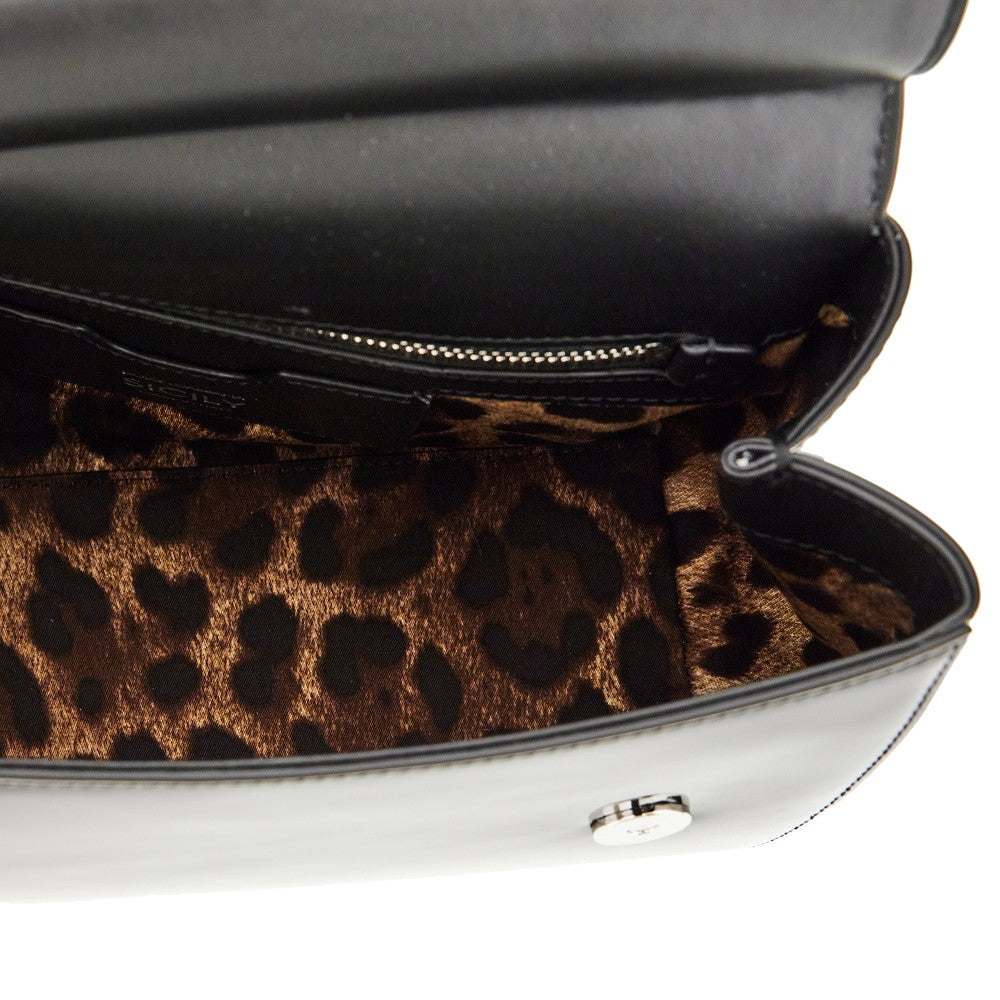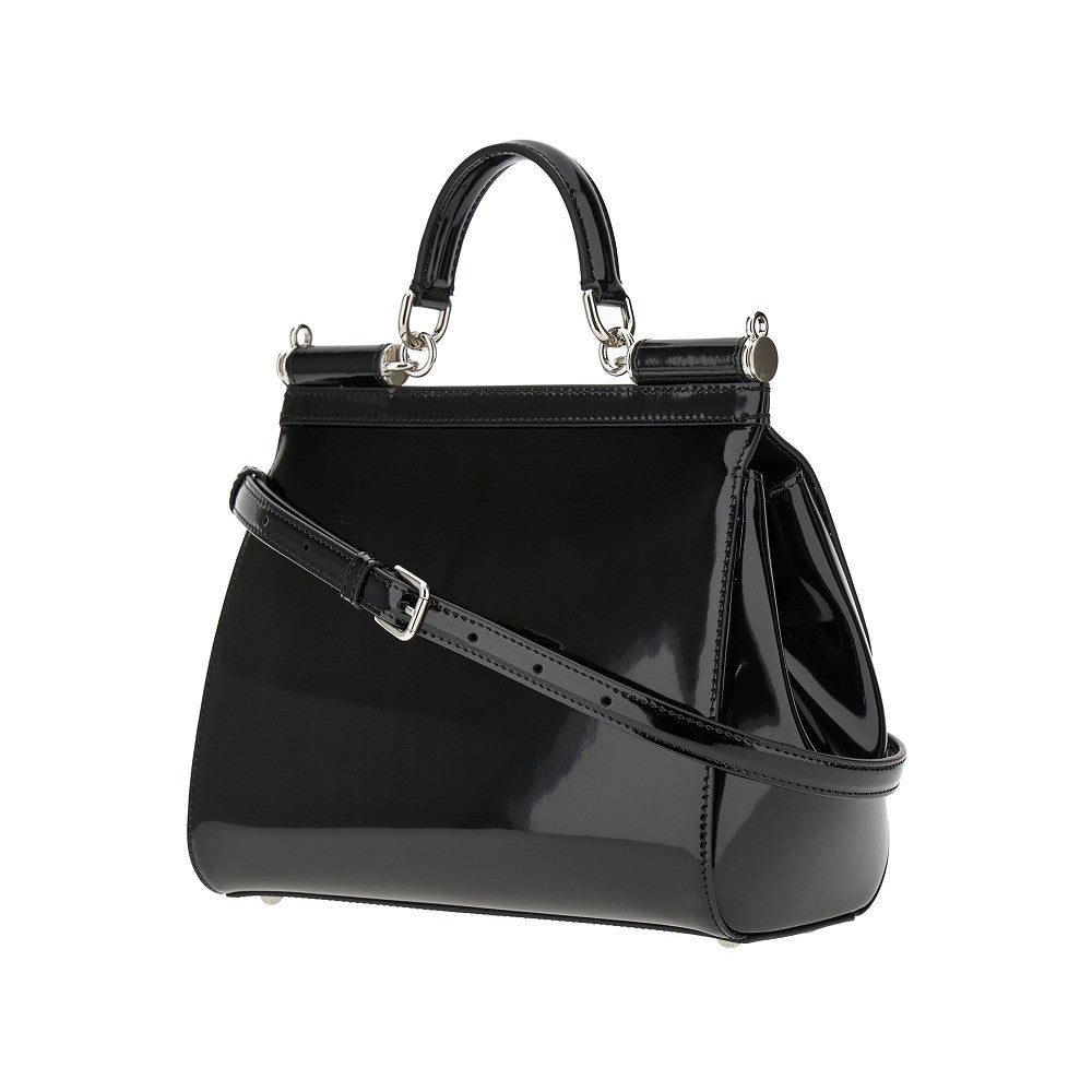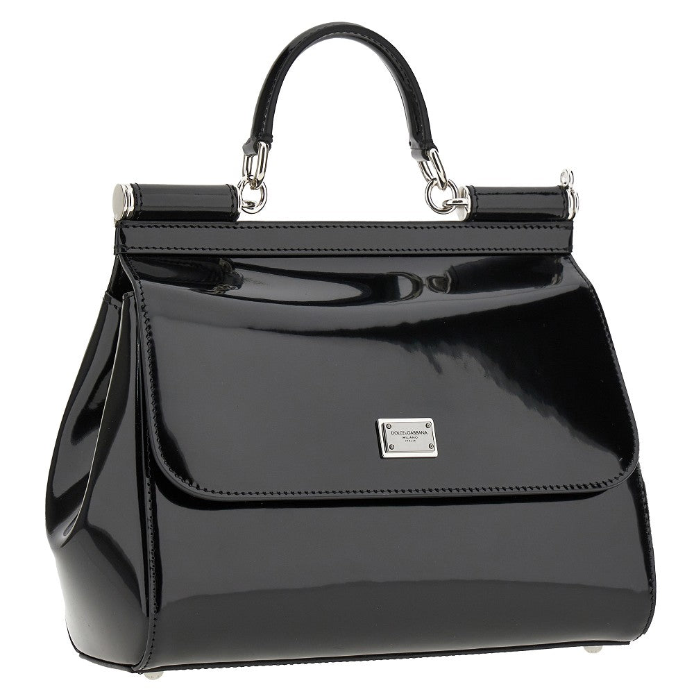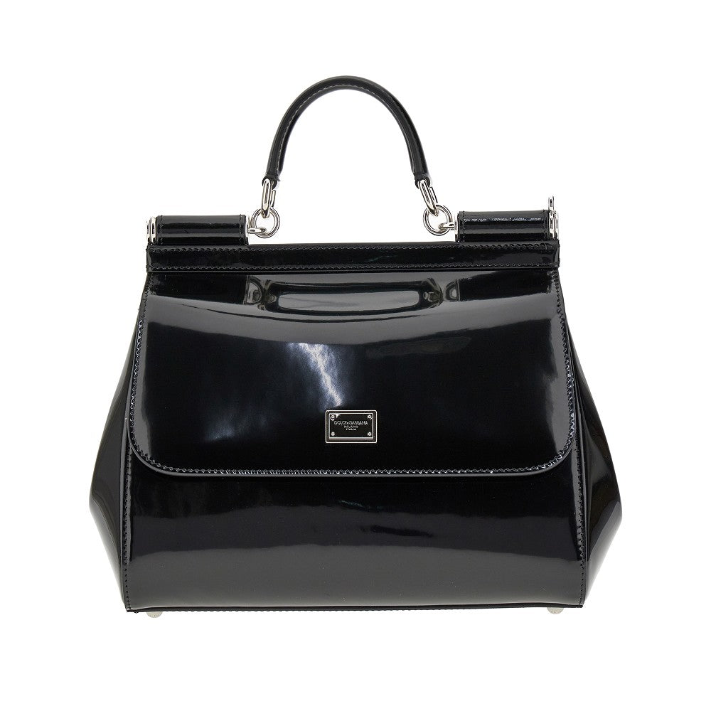 Borsa Sicily media in pelle lucida, caratterizzata dalla pattina con chiusura magnetica arricchita dall'iconica placchetta bigalvanica con logo inciso. Maniglia singola, tracolla removibile e regolabile in pelle, interno foderato in tessuto animalier con una tasca con zip e uno slot porta carte.