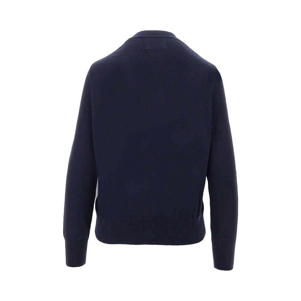 Cardigan realizzato in morbido filato di misto cotone organico e lana, arricchito dal logo ricamato a contrasto sul petto. Scollo a V e chiusura frontale con bottoni. Polsini e fondo capo rifiniti in micro costine. Vestibilità regolare.