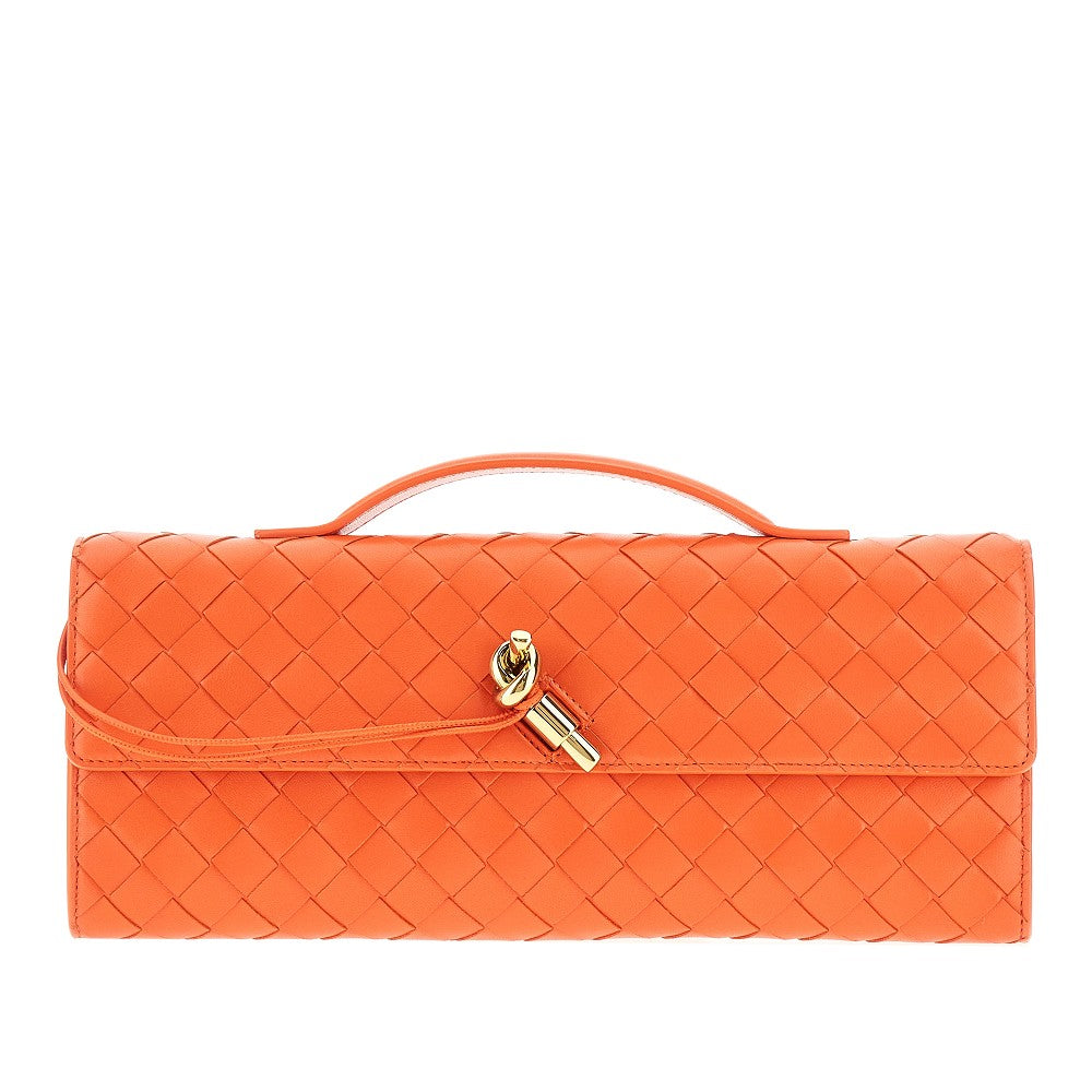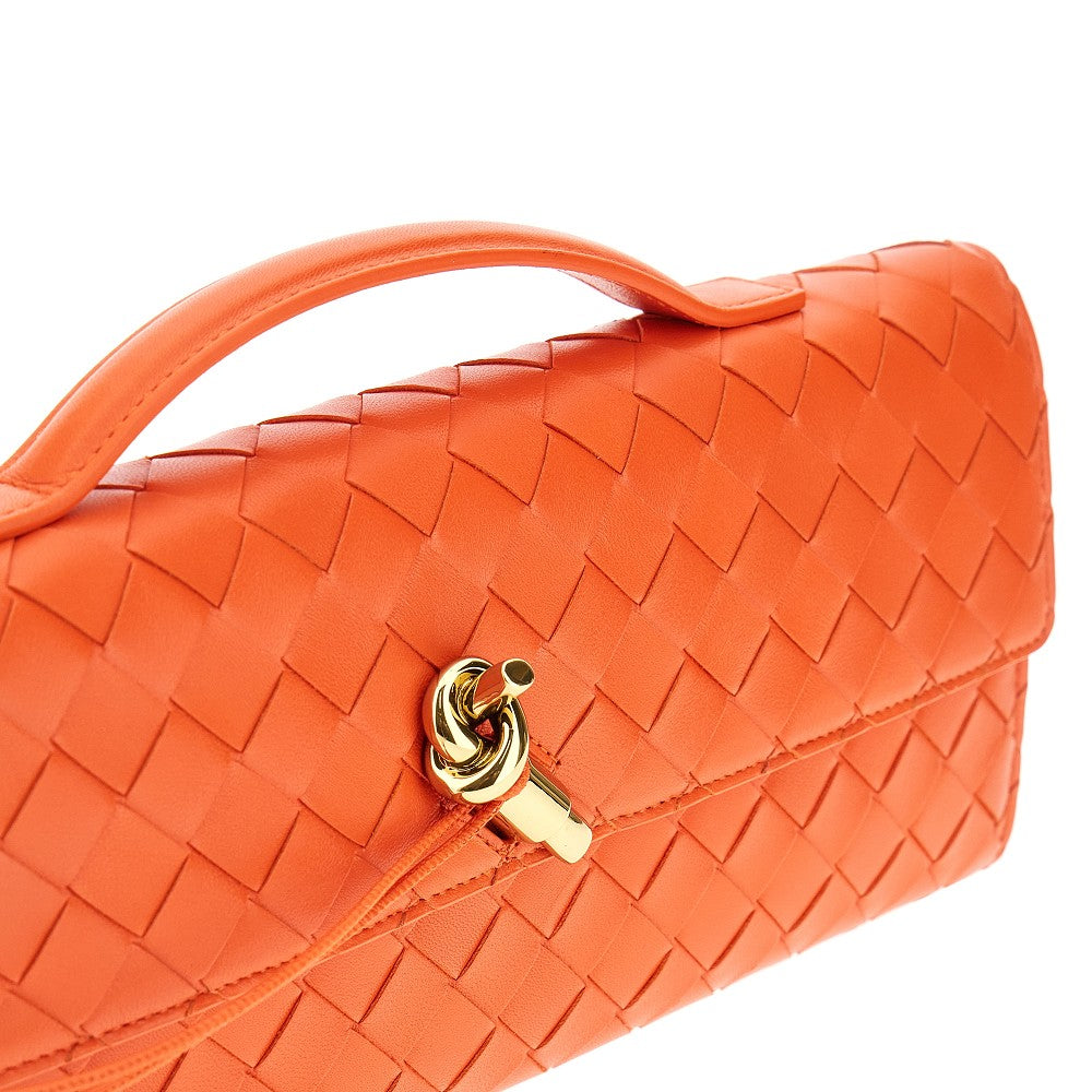Clutch con manico realizzata in nappa con l'iconica lavorazione Intrecciato, caratterizzata dalla pattina magnetica con chiusura Knot in metallo finitura oro. Interno foderato in pelle con una tasca a toppa e sei slot portacarte.