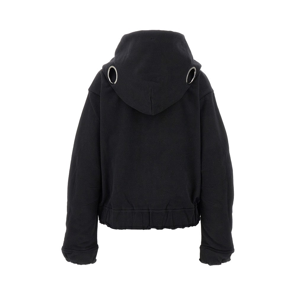 Felpa in morbido french terry di cotone con chiusura full-zip, caratterizzata dai dettagli cut-out con anelli in metallo argentato sul cappuccio. Tasche a marsupio rifinite in maglia a costine. Polsini e fondo capo elasticizzati con bordo a taglio vivo. Patch logo sul petto. Vestibilità comoda.