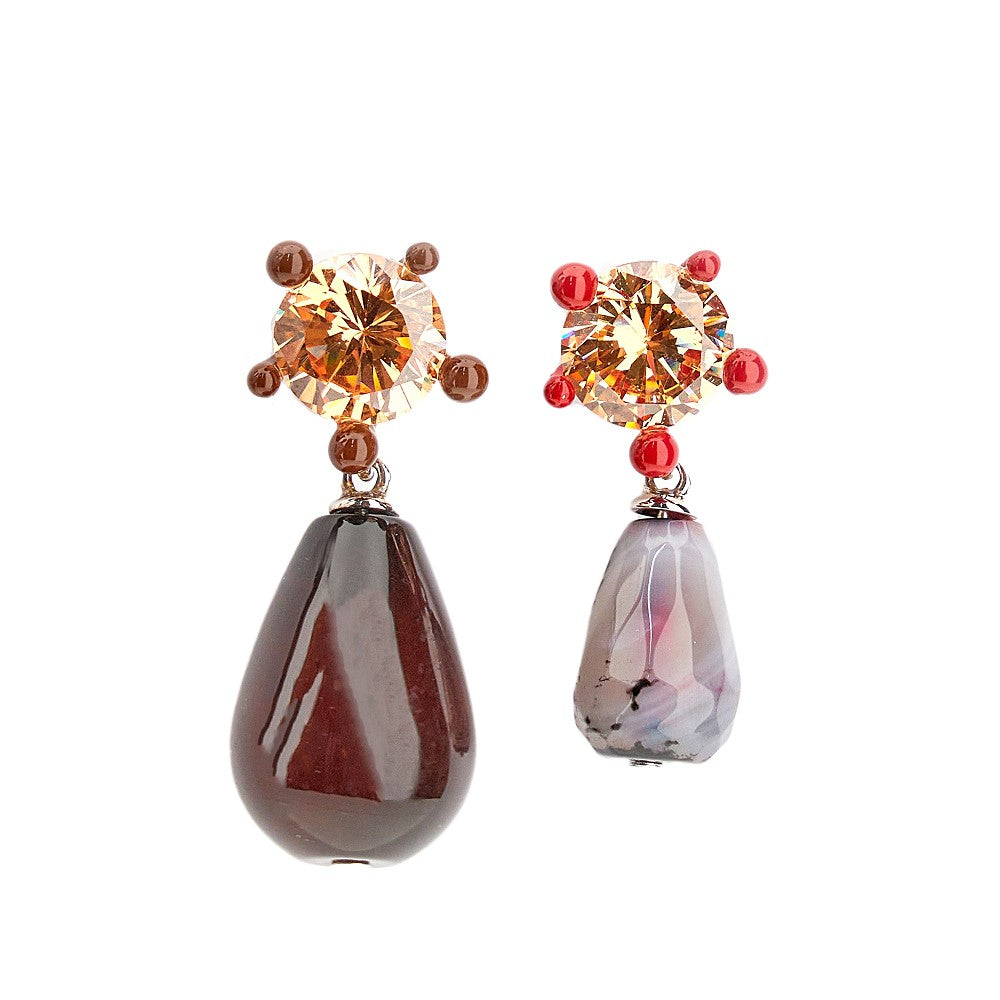 Orecchini asimmetrici realizzati in ottone smaltato, arricchiti dal cristallo incastonato e dalle pietre di Agata pendenti. Perno e chiusura in ottone finitura argento. Per lobi forati.