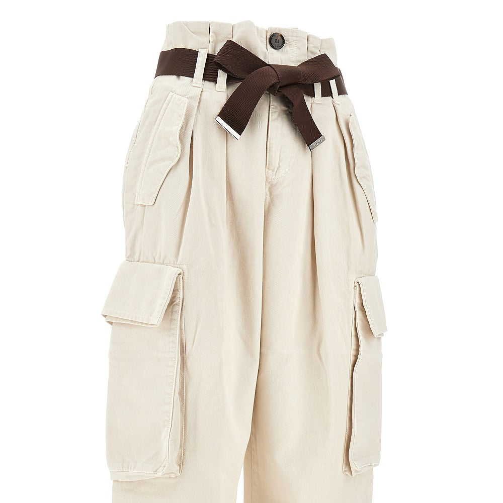 Pantalone cargo realizzato in gabardina di cotone tinta in capo, caratterizzato da gamba ampia e arrotondata. Silhouette a vita alta con cintura removibile in gros-grain da annodare. Tasche laterali a filetto con pattina e bottone a pressione a scomparsa.