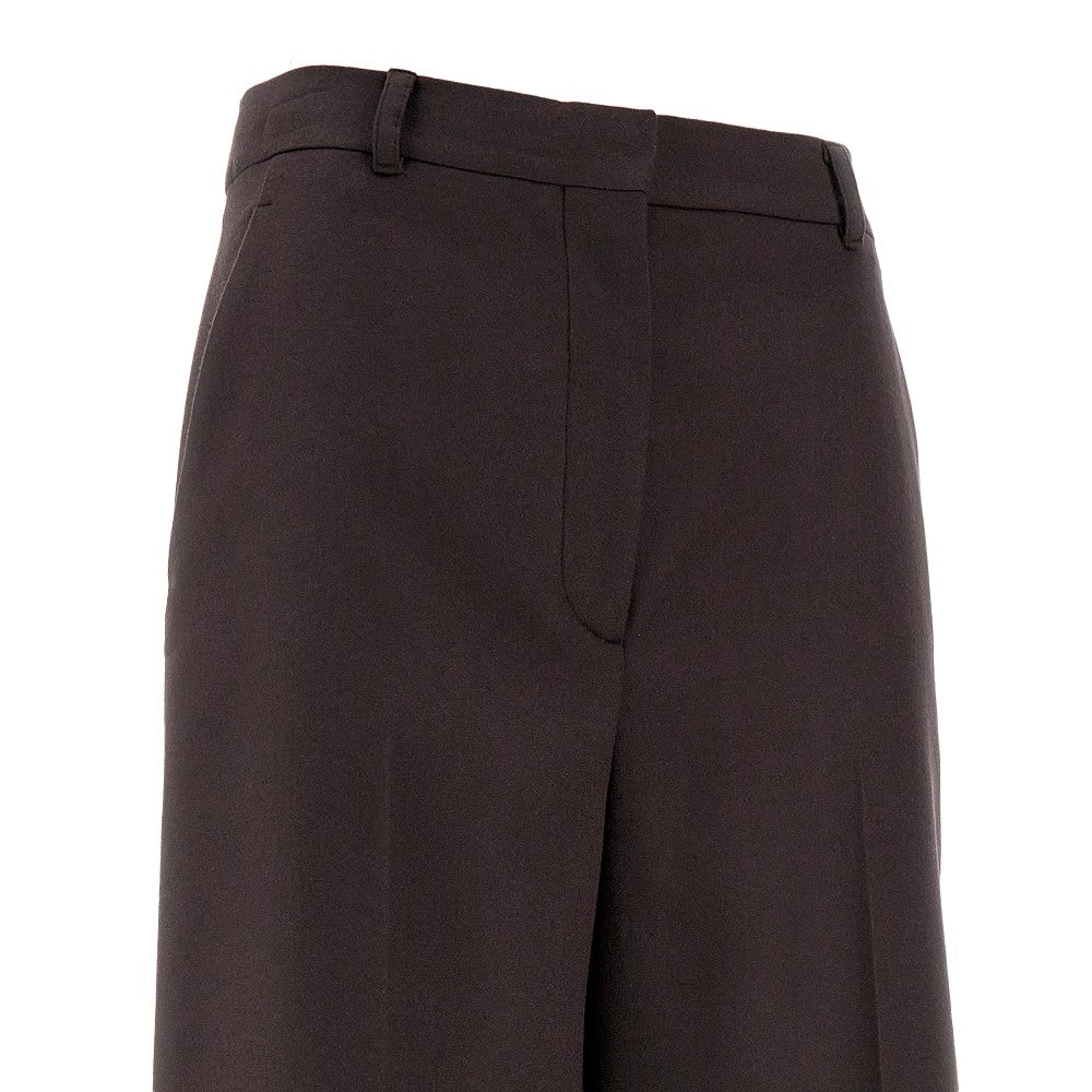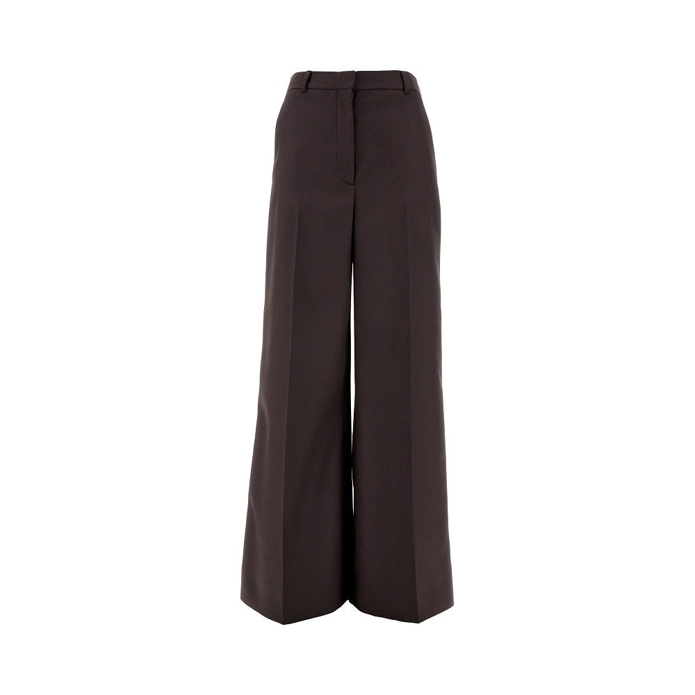 Pantalone realizzato in flanella di lana sostenibile, caratterizzato da gamba ampia e svasata. Silhouette regolare a vita media con passanti per cintura, patta con zip e chiusura con gancetti e bottone a scomparsa. Tasche oblique sui fianchi.