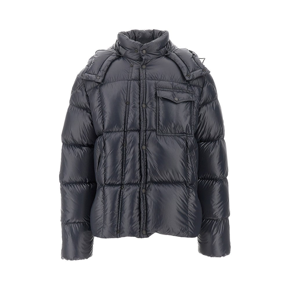 Piumino in nylon super laqué con imbottitura in piuma. Chiusura zip a doppio cursore e patta con doppia fila di bottoni a pressione per regolarne l'ampiezza. Cappuccio rimovibile. Tasche a filetto con zip e tasca a toppa sul petto con patta. Fondo manica elasticizzato e fondo capo regolabile.