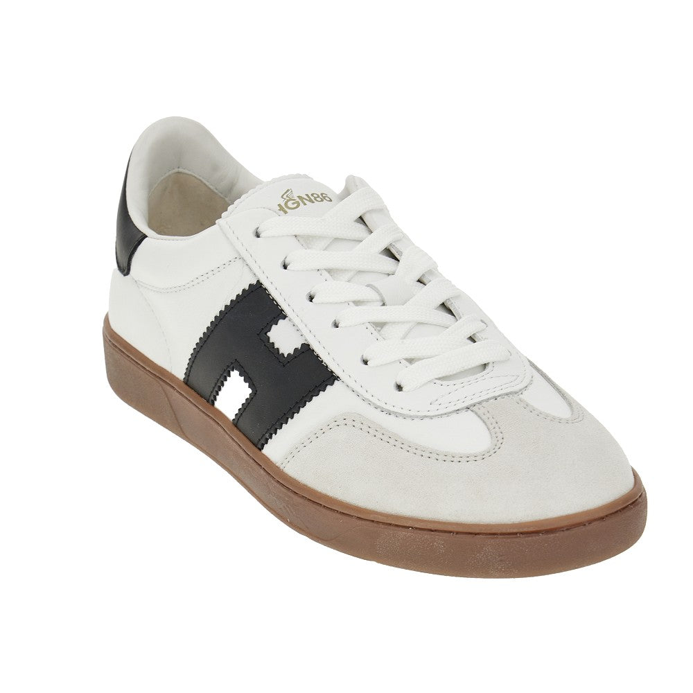 Sneakers Hogan Cool in morbida pelle, caratterizzata dal patch monogram H sui lati e dallo spoiler in pelle a contrasto. Stampa logo dorata sulla linguetta. Chiusura stringata. Fodera in tessuto, soletta removibile in Memory Foam e suola in gomma. Lacci di ricambio inclusi.