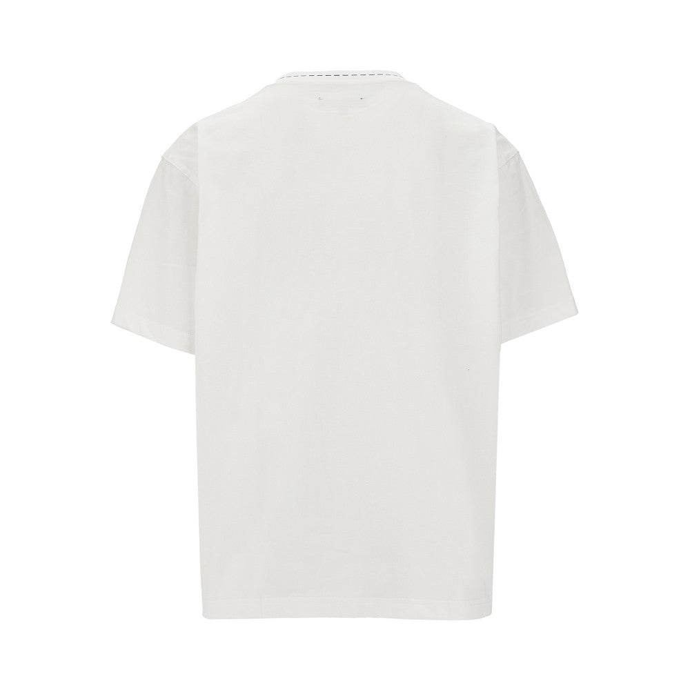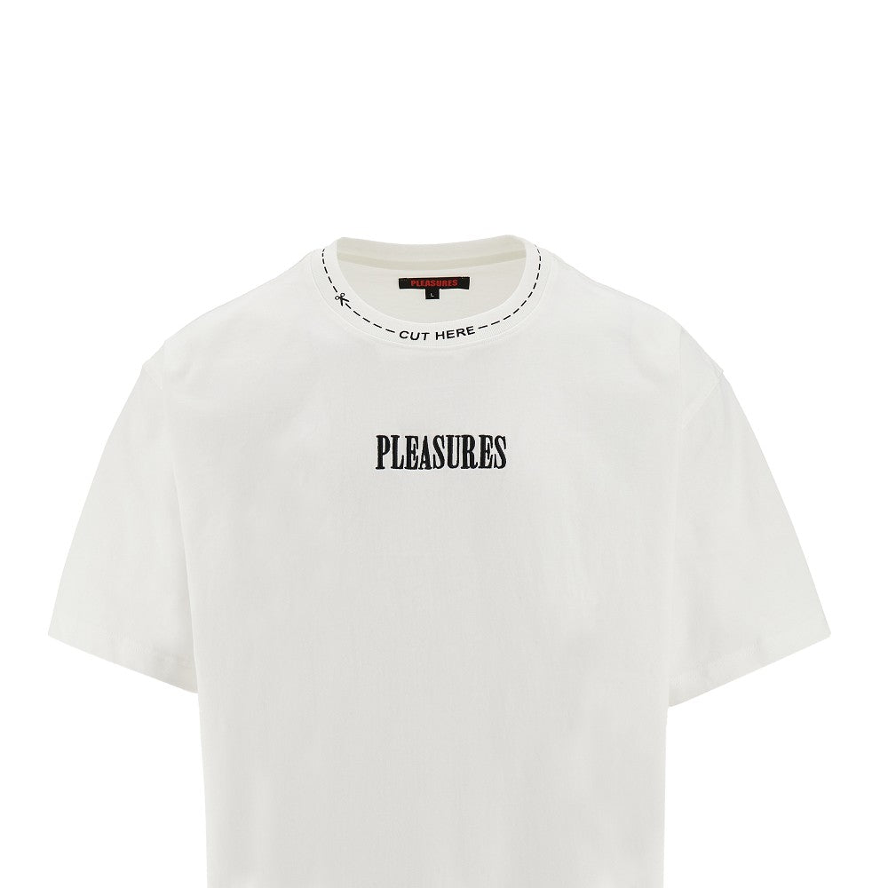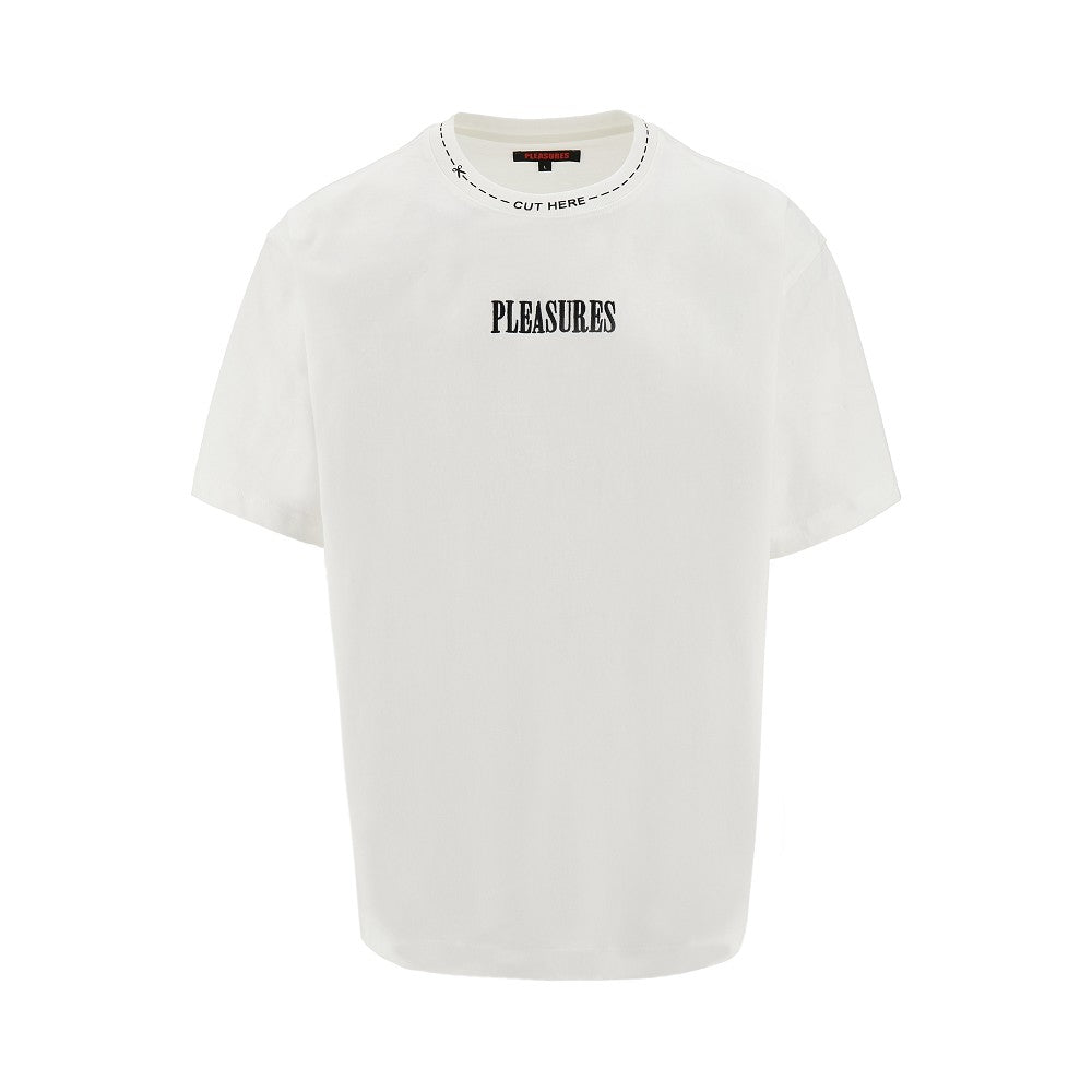 T-shirt a manica corta realizzata in pesante jersey di cotone, caratterizzata dal girocollo rifinito in micro costine con stampa "Cut here". Logo lettering ricamato sul davanti. Taglio dritto e leggermente largo.