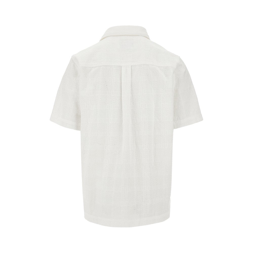 Camicia a manica corta realizzata in tessuto sangallo di puro cotone. Chiusura con bottoni, colletto classico a punta e tasca a toppa sul petto. Vestibilità regolare.