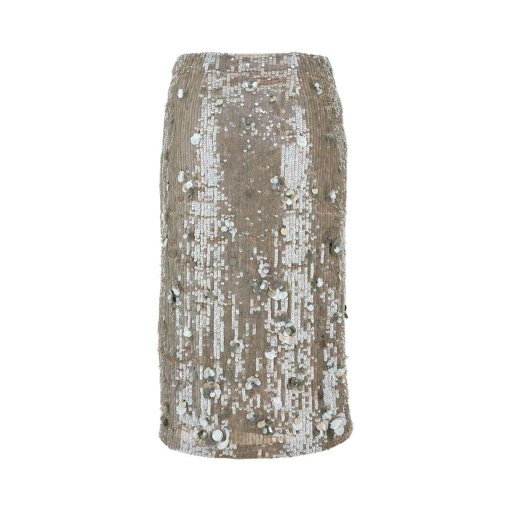 Gonna longuette realizzata in mesh stretch con paillettes ricamate all-over, arricchita dal dettagli floreali con cristalli. Silhouette aderente a vita alta. Vita elastica. Fodera in mesh stretch.