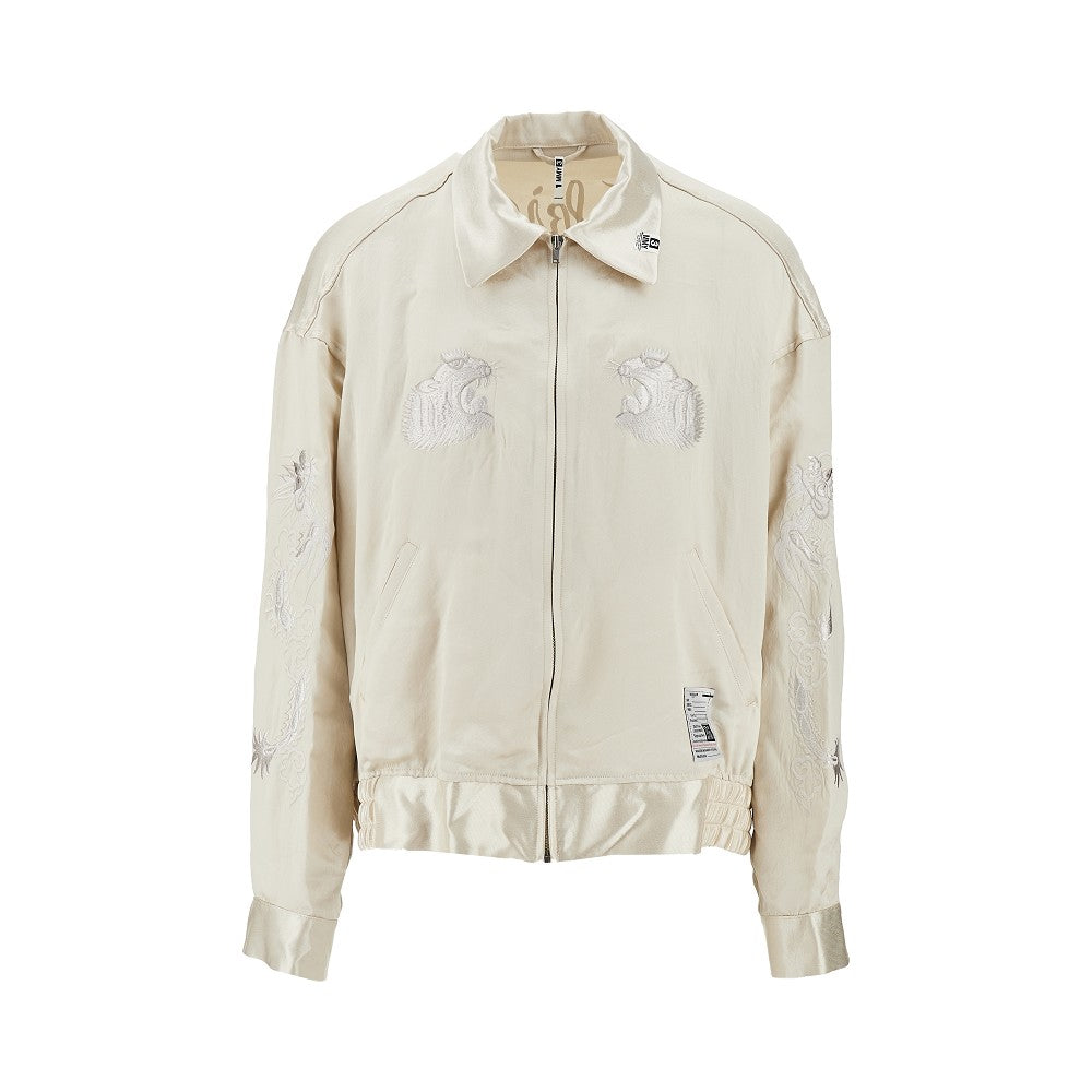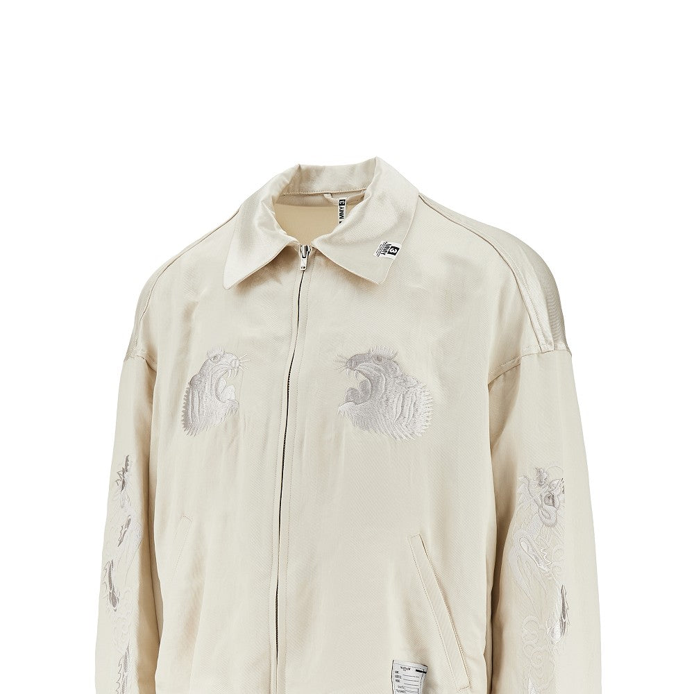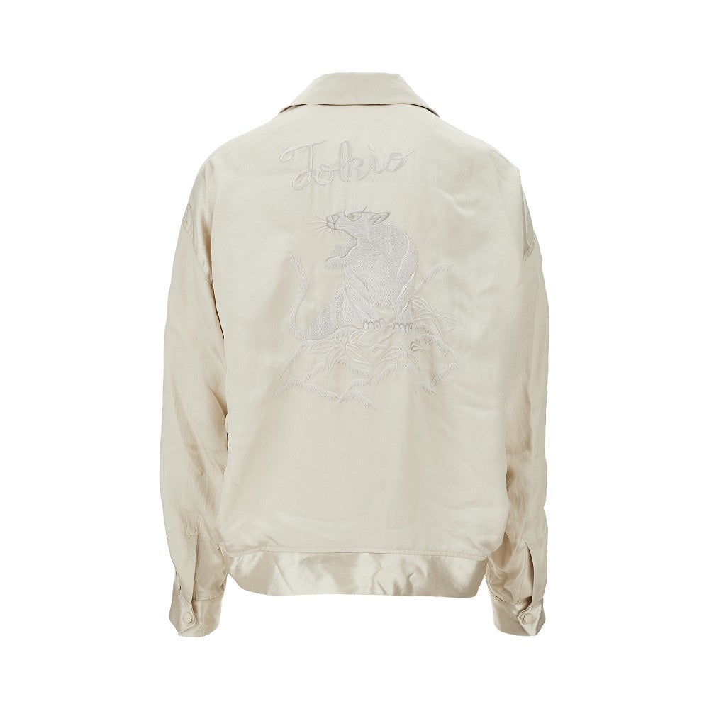 Souvenir jacket realizzata in leggero twill dal finish satinato, arricchita dai motivi ricamati d'ispirazione giapponese. Chiusura full-zip, colletto classico a punta, tasche laterali a filetto, polsini con bottone a pressione e fondo capo elasticizzato. Vestibilità rilassata con spalle scese.