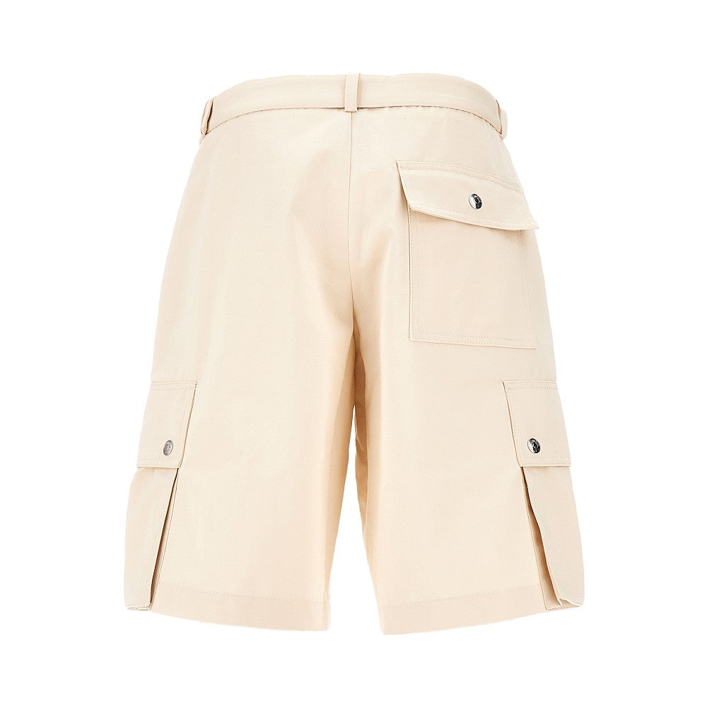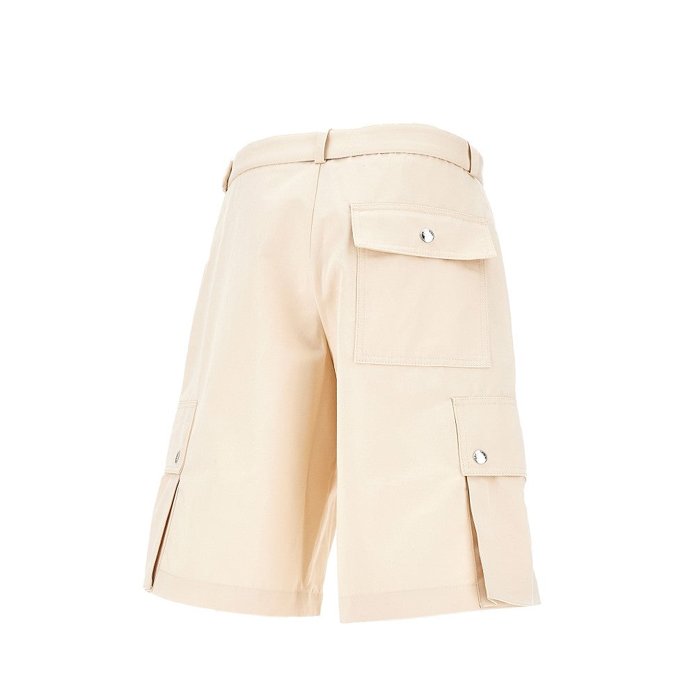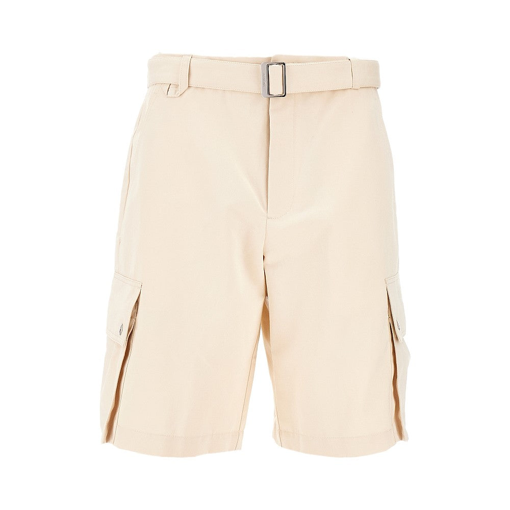 Bermuda in twill di cotone e lino, accessoriato di cintura abbinata con fibbia in metallo argentato con logo inciso. Gamba ampia con tasca cargo sul lato. Vita regolare con passanti, patta con zip e chiusura con gancio e bottone a scomparsa. Tasche laterali oblique e una a toppa sul retro.