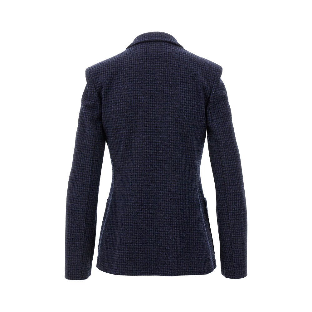 Blazer realizzato in morbido tessuto elasticizzato di misto lana e cotone con motivo pied-de-poule. Chiusura doppiopetto con bottoni in metallo dorato, revers dentellati e tasche laterali a toppa. Silhouette slim con spalle imbottite. Sfoderato.