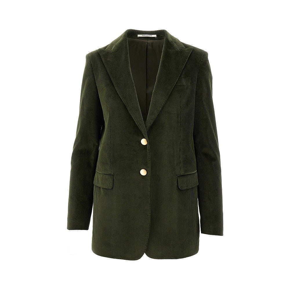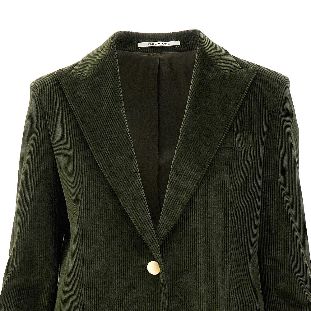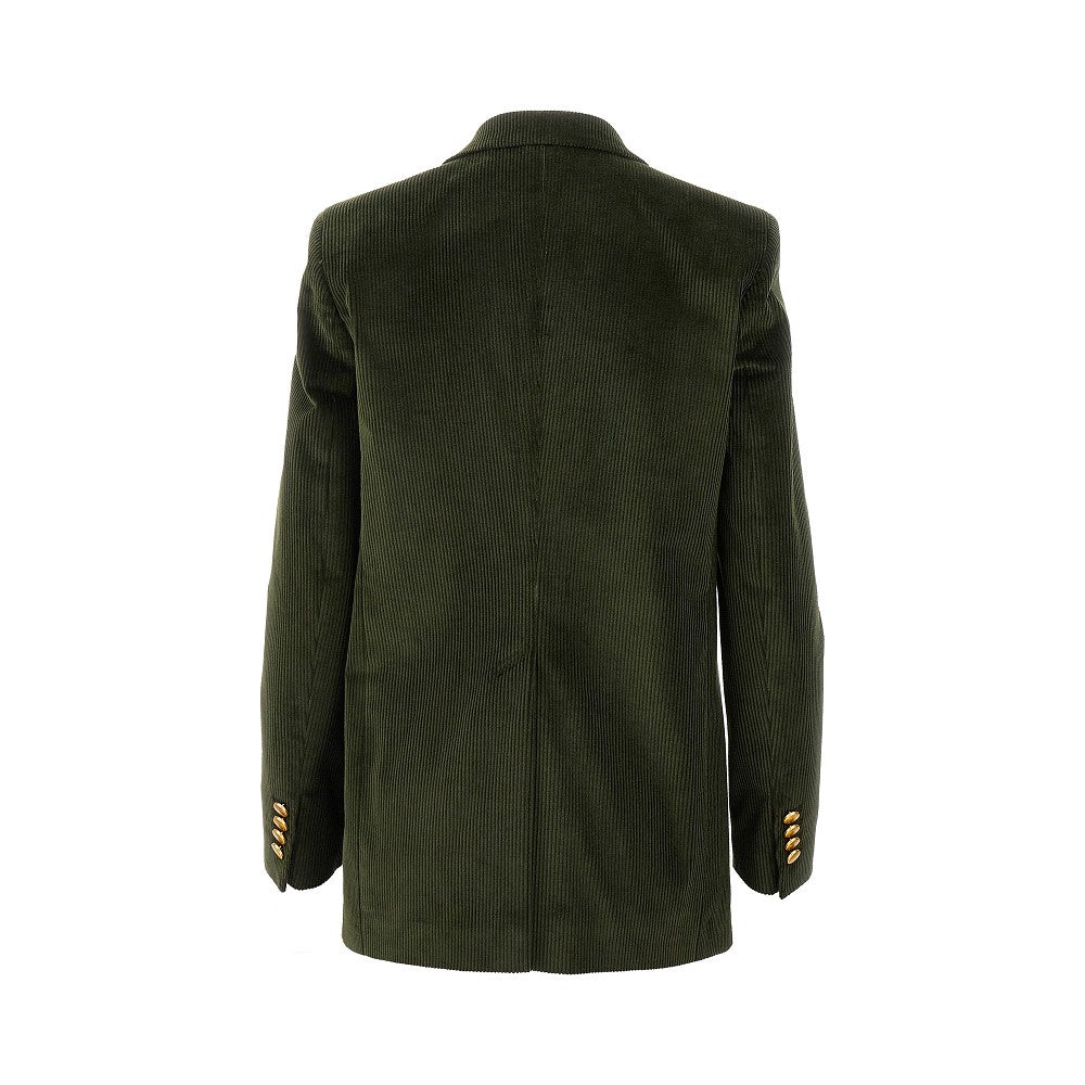 Giacca realizzata in velluto di cotone a costine. Chiusura monopetto con bottoni in metallo opaco finitura oro, revers a lancia, tasche laterali a filetto con pattina, tasca profilata sul petto, fondo manica con bottoni e spacco centrale sul retro. Fodera in cupro. Vestibilità regolare.