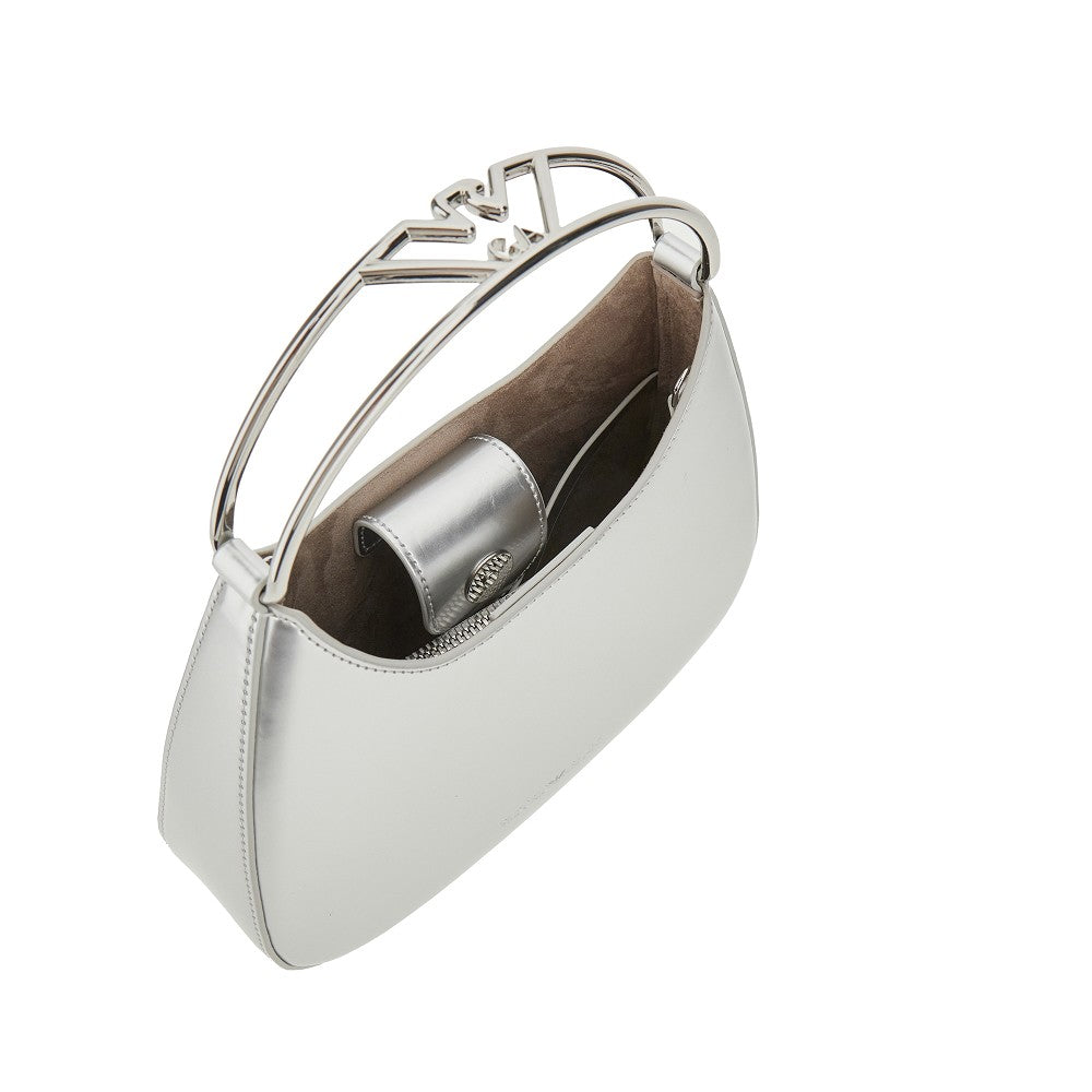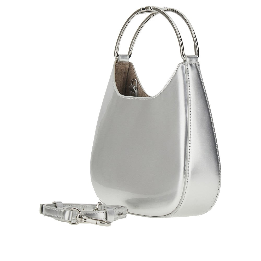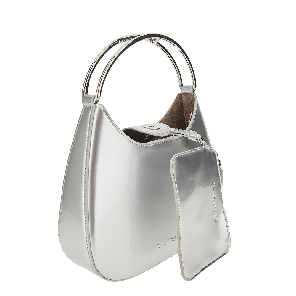 Mini hobo bag in finta pelle metallizzata effetto vernice, caratterizzata dal manico in metallo finitura argento con motivo Eagle. Logo impresso sul davanti. Tracolla removibile e regolabile. Chiusura con bottone magnetico. Fodera in suedette. Pouch interno coordinato removibile.