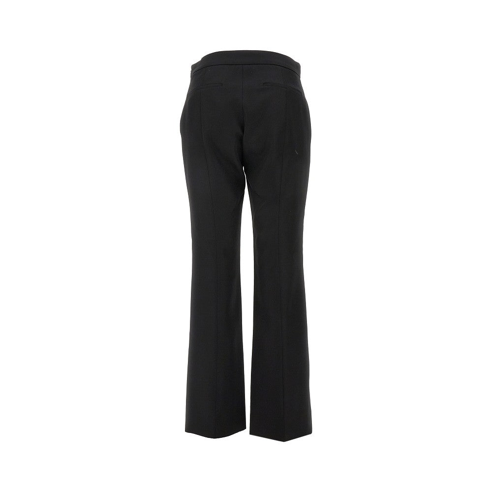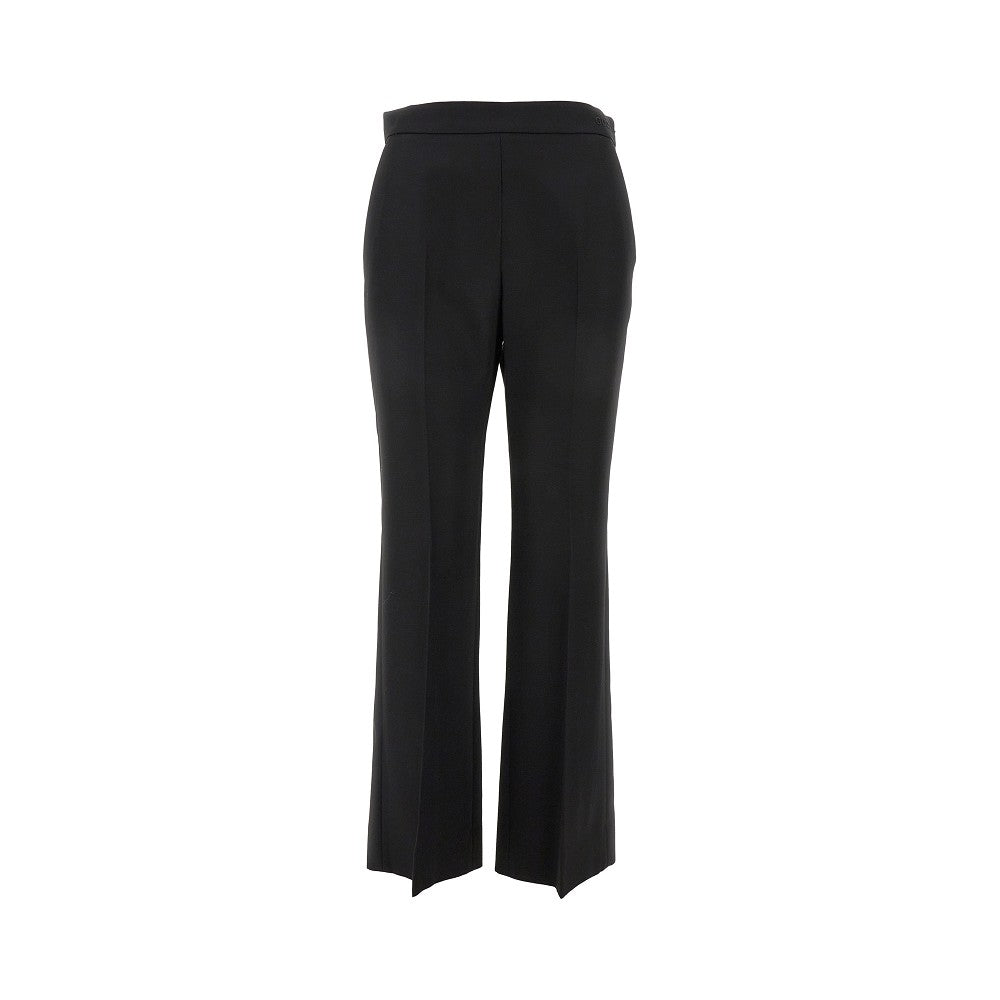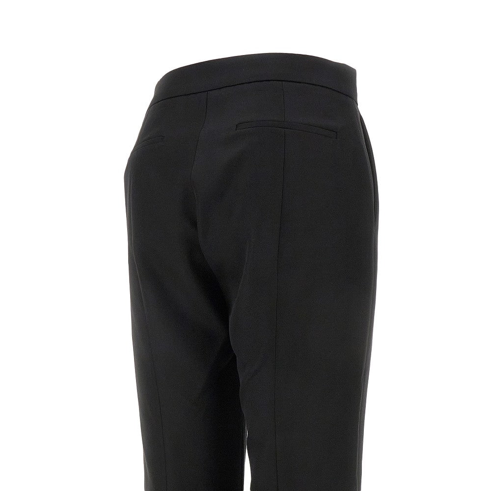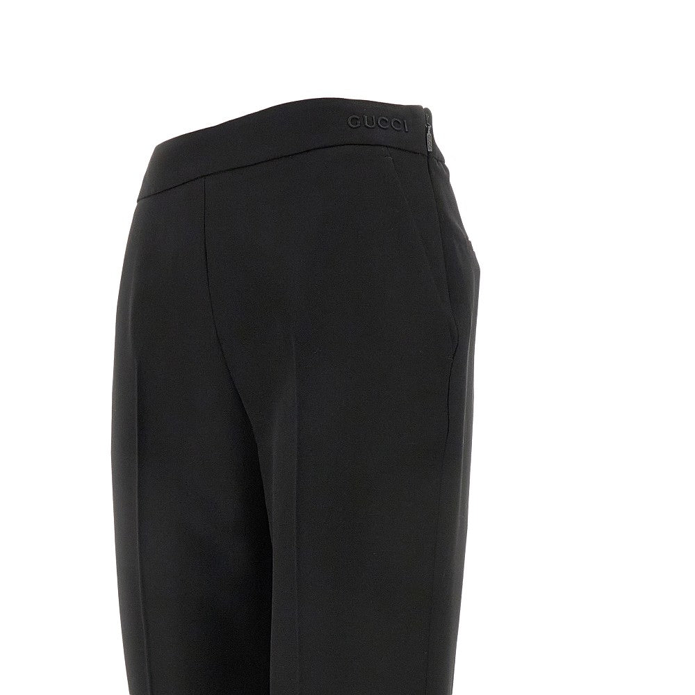 Pantalone realizzato in gabardine di misto lana e mohair, caratterizzato da gamba dritta con lunghezza cropped alla caviglia. Vita medio-alta con logo lettering ricamato tono su tono sul lato sinistro. Tasche laterali alla francese e a filetto sul retro. Chiusura laterale con zip a scomparsa.