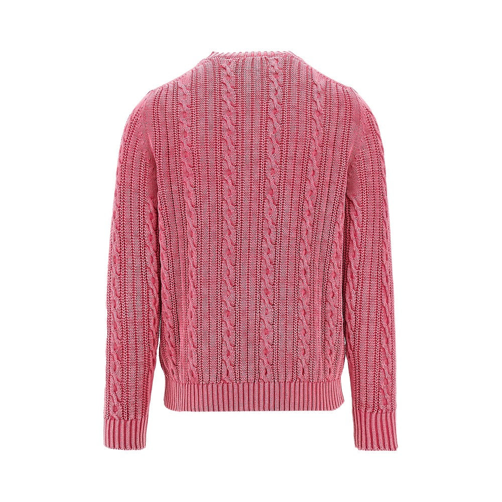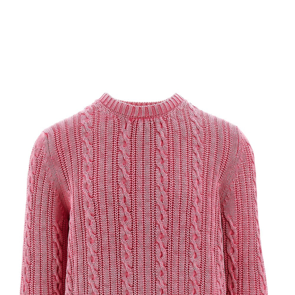 Pullover realizzato in filato di puro cotone con lavorazione a trecce e finitura ad effetto slavato. Girocollo, polsini e fondo capo a costine. Vestibilità regolare.
