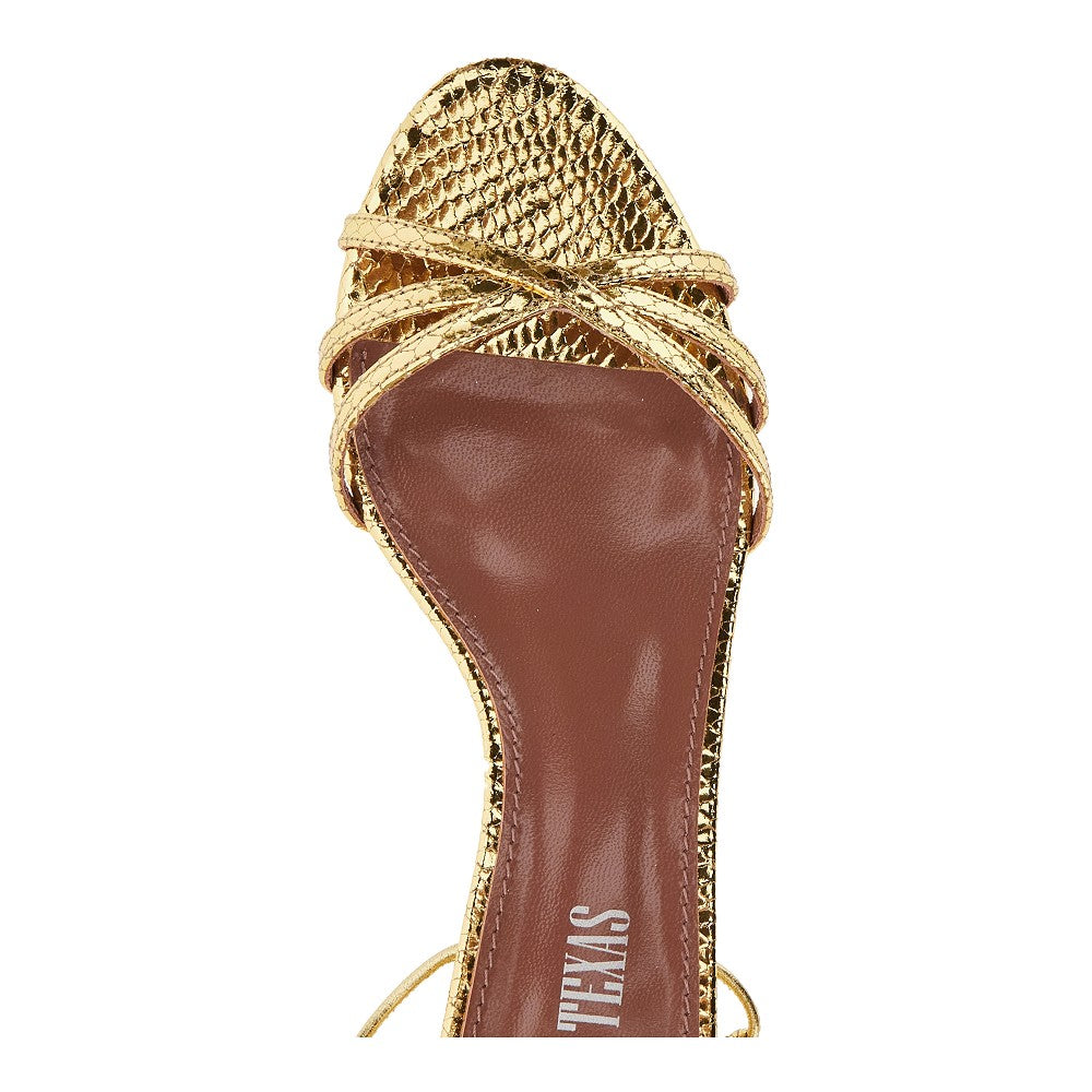 Sandali realizzati in pelle metallizzata effetto pitone, caratterizzata dalla chiusura con sottili nastri da avvolgere e annodare sulla caviglia. Sottopiede in pelle liscia. Tacco rivestito in pelle. Suola in cuoio.