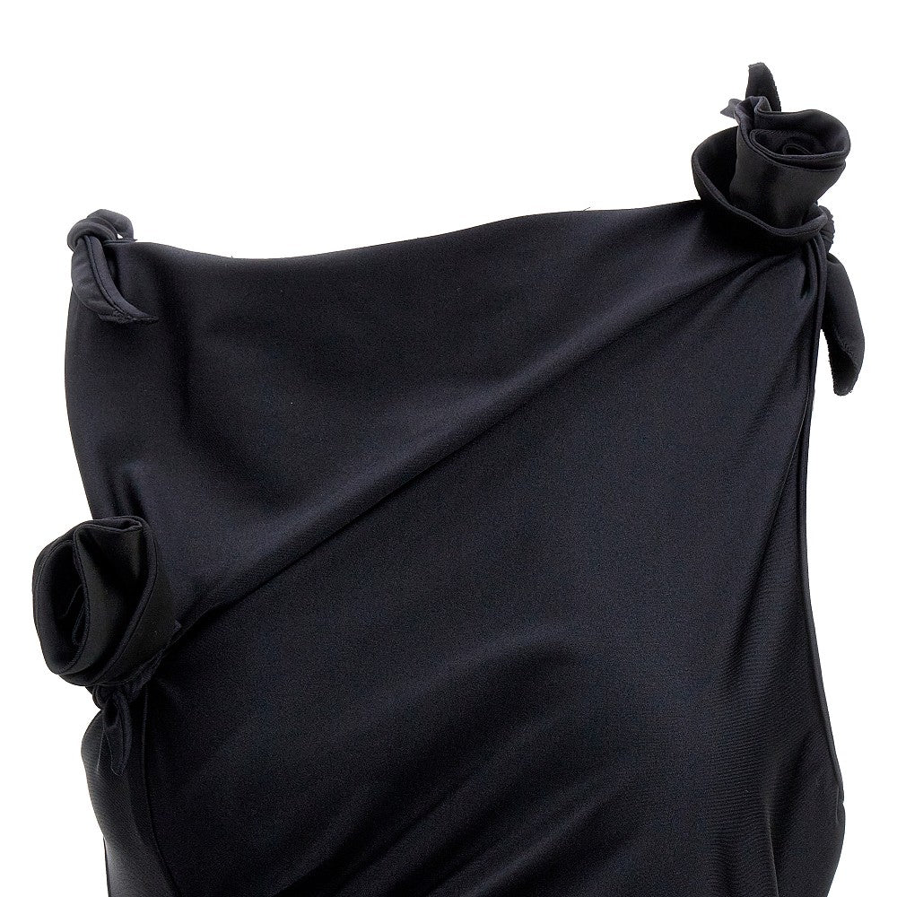 Abito alla caviglia in jersey tecnico elasticizzato, caratterizzato dall'effetto drappeggiato sul busto con dettagli floreali nel medesimo tessuto e fiocchi ad effetto nodo sulle spalle. Cut-out diagonale sulla scollatura. Silhouette aderente con spacchi laterali e fondo capo asimmetrico.