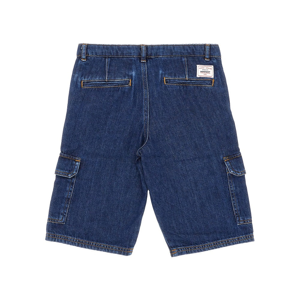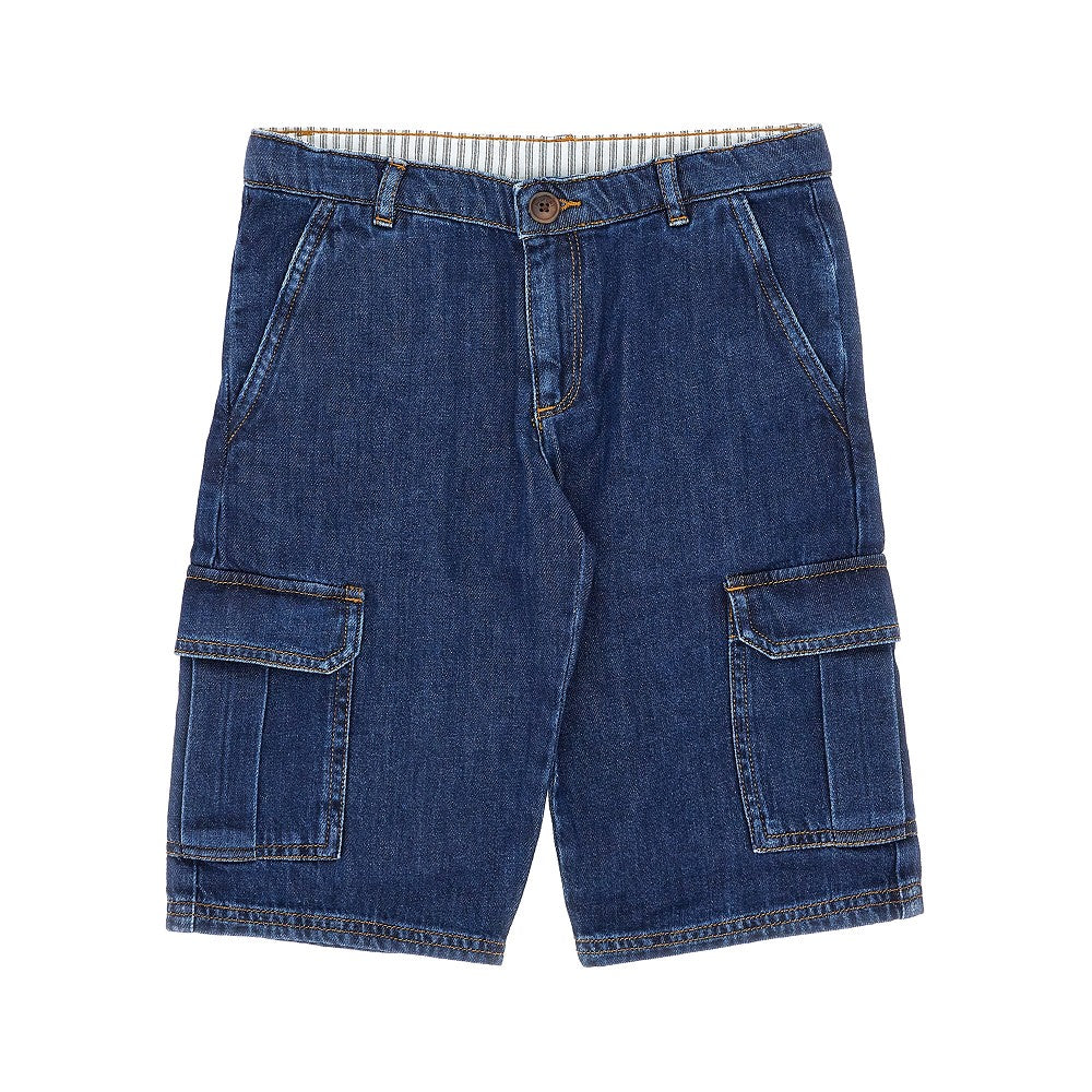 Bermuda realizzati in denim di cotone, caratterizzati dalle tasche cargo con patta sul lato delle gambe. Vita regolabile con cinturini elastici interni, passanti per cintura, patta con zip e chiusura con bottone. Tasche oblique sui fianchi e a filetto sul retro. Etichetta logo applicata sul retro.