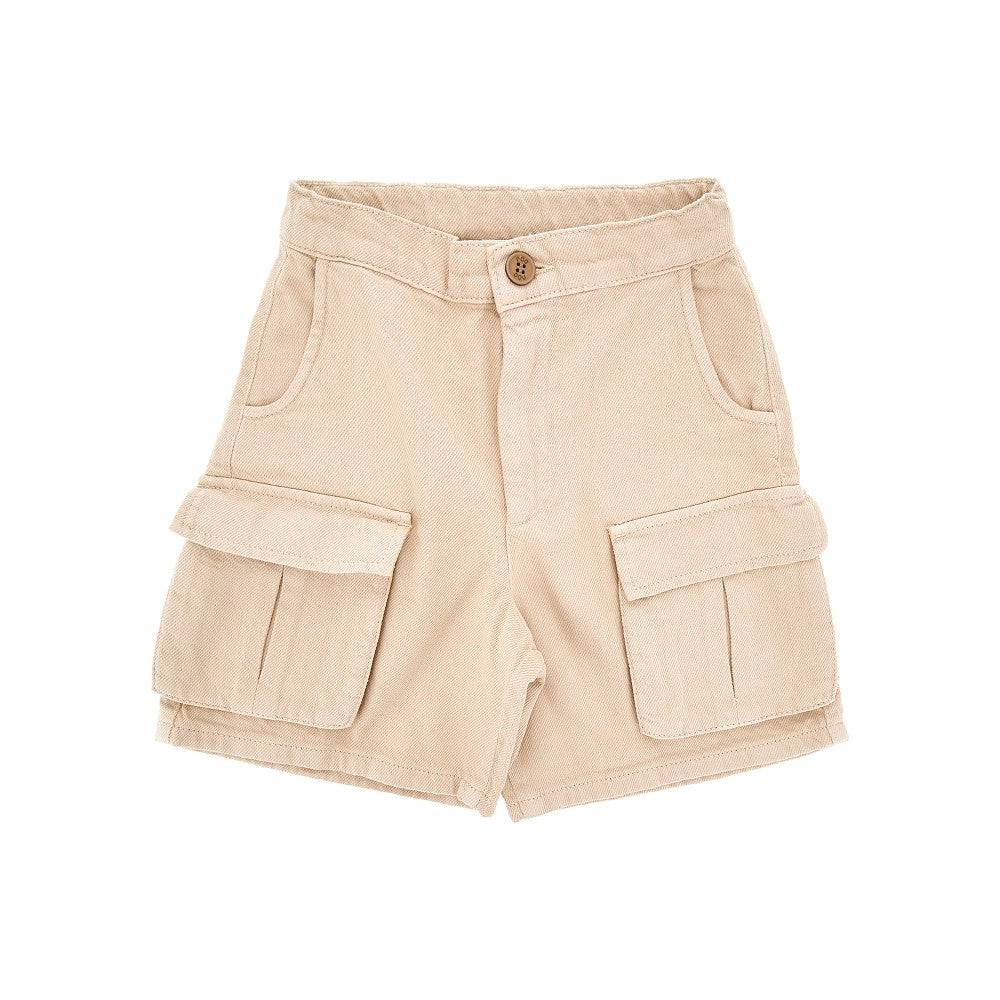 Bermuda realizzati in morbido bull denim di cotone tinto in capo, caratterizzati da gamba ampia con tascone cargo con sui lati. Vita regolabile con cinturini elastici interni, patta con zip e chiusura con bottone. Tasche arrotondate sui fianchi e una tasca a toppa con patta sul retro.