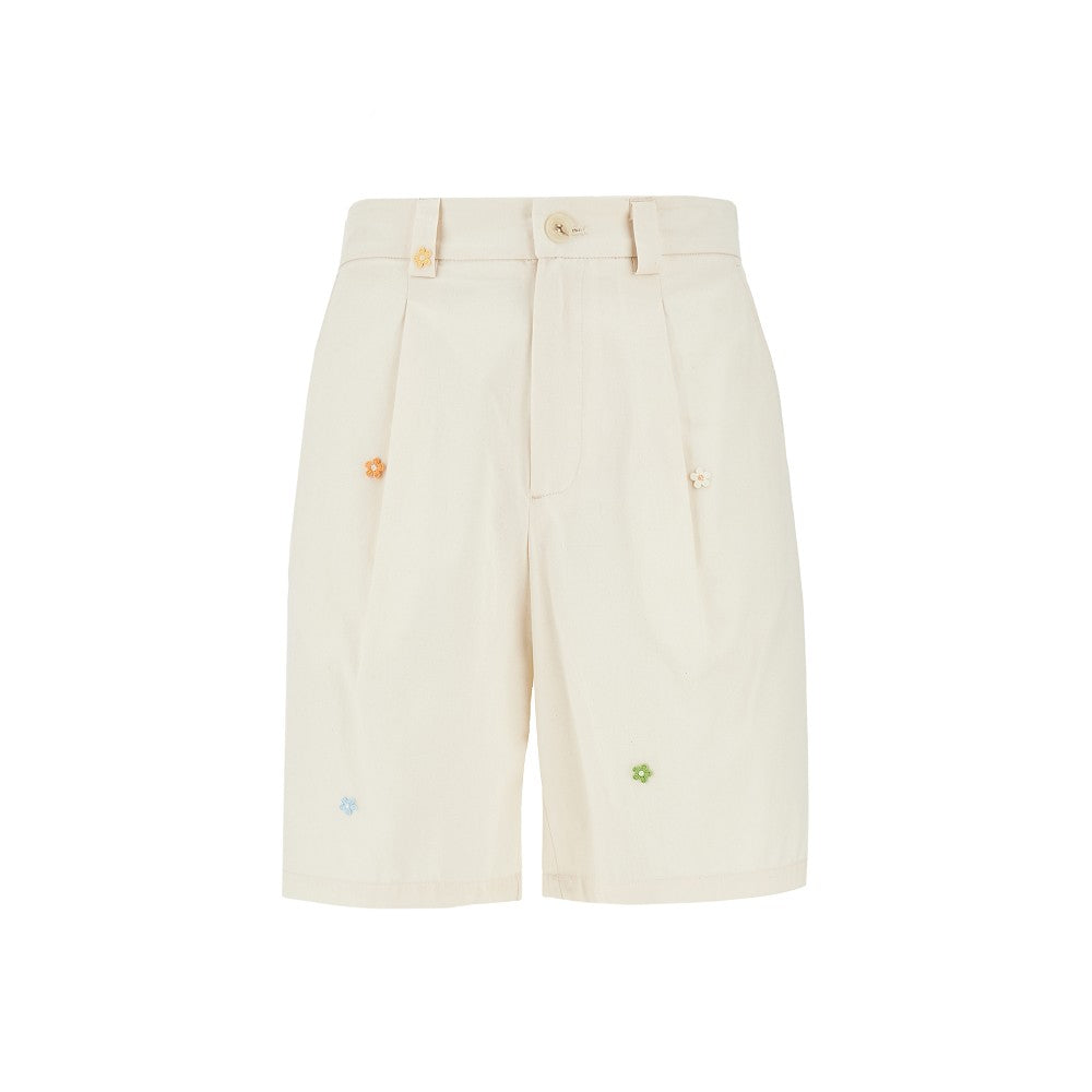 Bermuda realizzati in morbido gabardine di puro cotone, arricchiti dai fiorellini ricamati applicati. Vita media con passanti per cintura, patta con zip e chiusura con bottone. Gamba dritta con pince centrale. Tasche oblique sui fianchi e una a toppa sul retro. Vestibilità regolare.